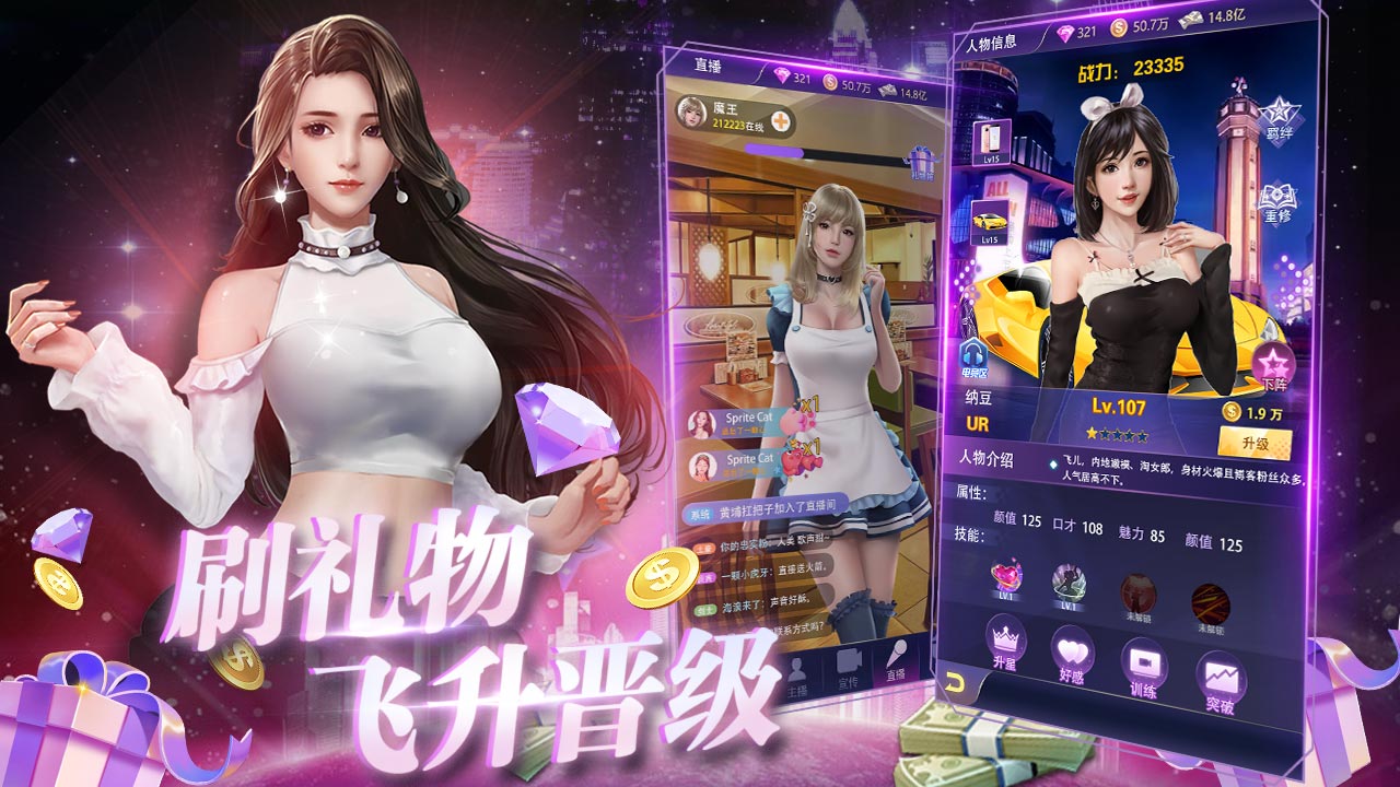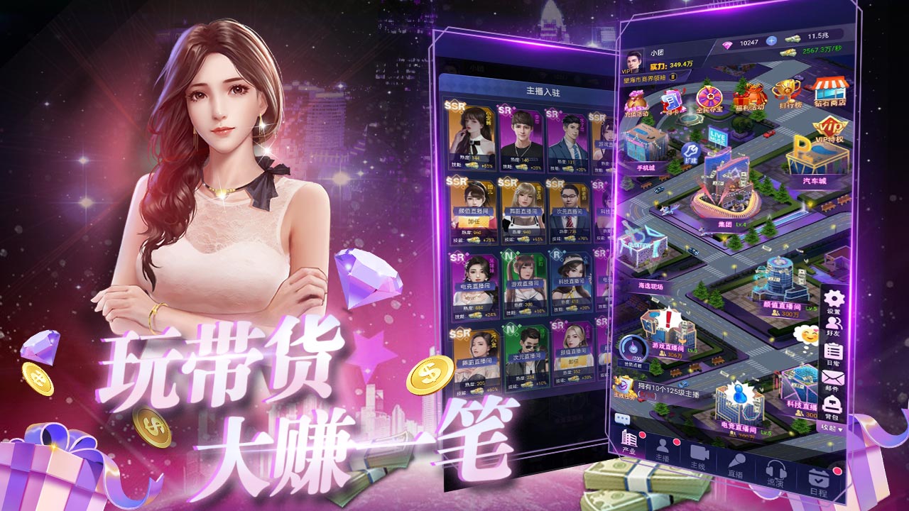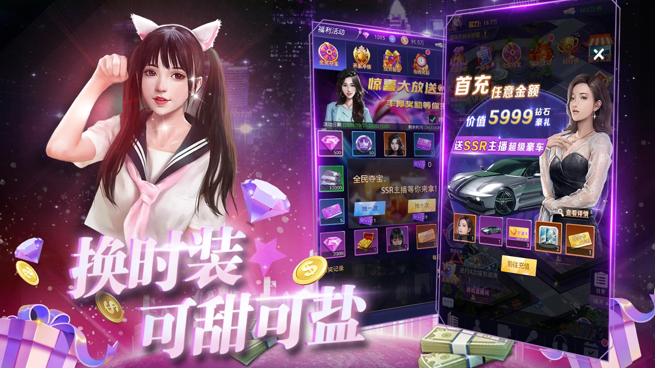 ★开局海量资源大放送,UR女神主播、0.1折特权称号、劳斯莱斯、8888钻石和现金1亿★0.1折福利,SSR角色免费领,每日登录即领取,通关主线轻轻松松★所有充值永久0.1折、拒绝物价膨胀★游戏内处处是福利,极品道具拿到手软
