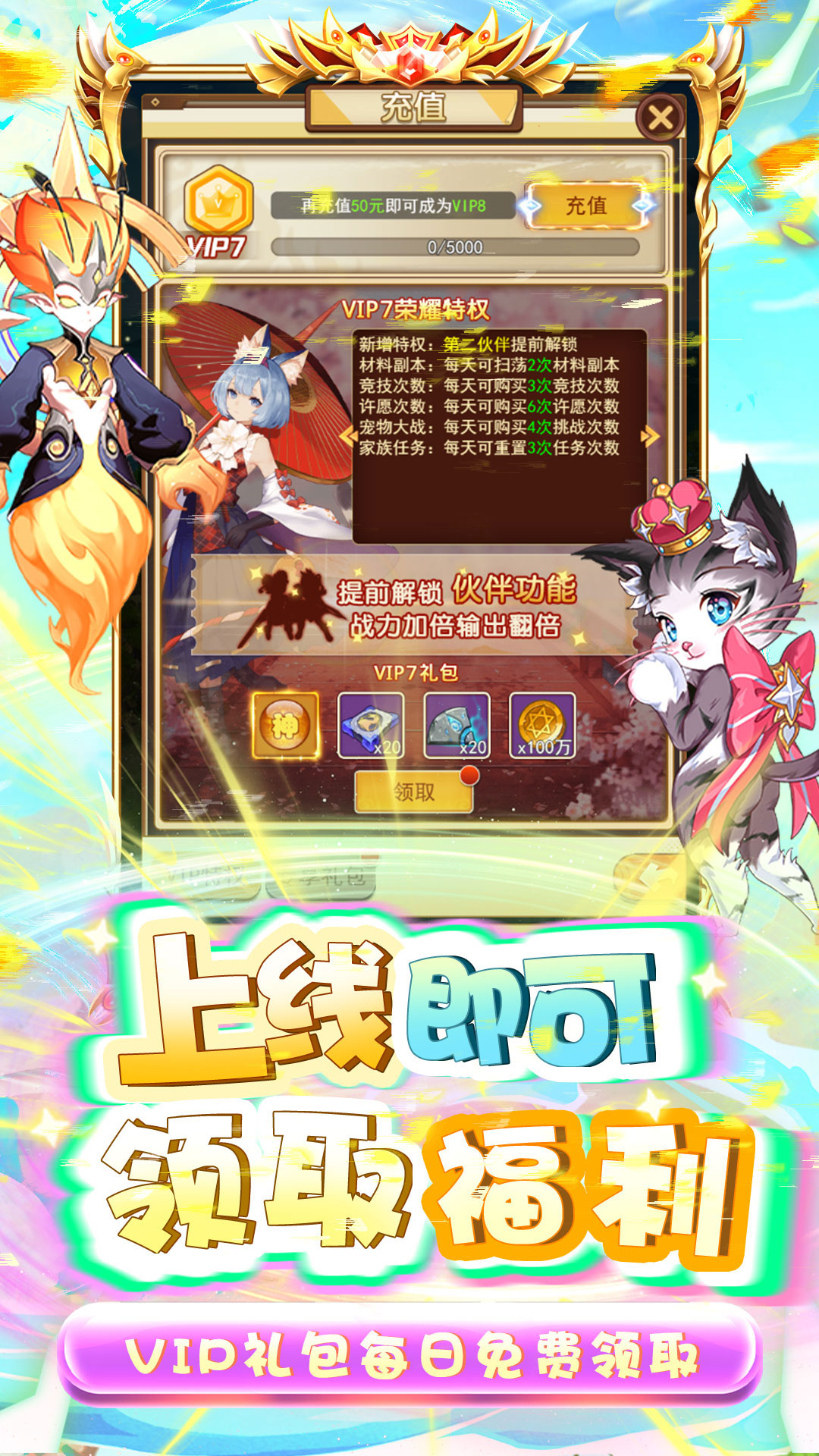 1.上线即可领取V7,VIP礼包每日免费领取!2.七日狂欢得超强暴击骑宠!3.累登累计百万钻石等你来拿!4.每日登录送钻石、稀有装备、伙伴!5.挑战送图腾、神宠,超强控制,恐惧全场!