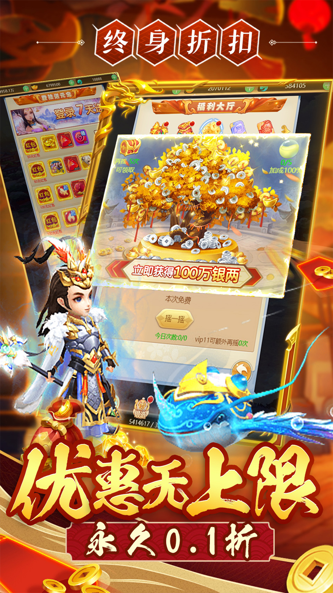 1、所有充值统统0.1折2、上线送VIP10福利,免费领取丰厚豪礼3、提升战力再送奖励,超多抽奖爽到没边4、登录就送4SR超强伙伴,战力飞升