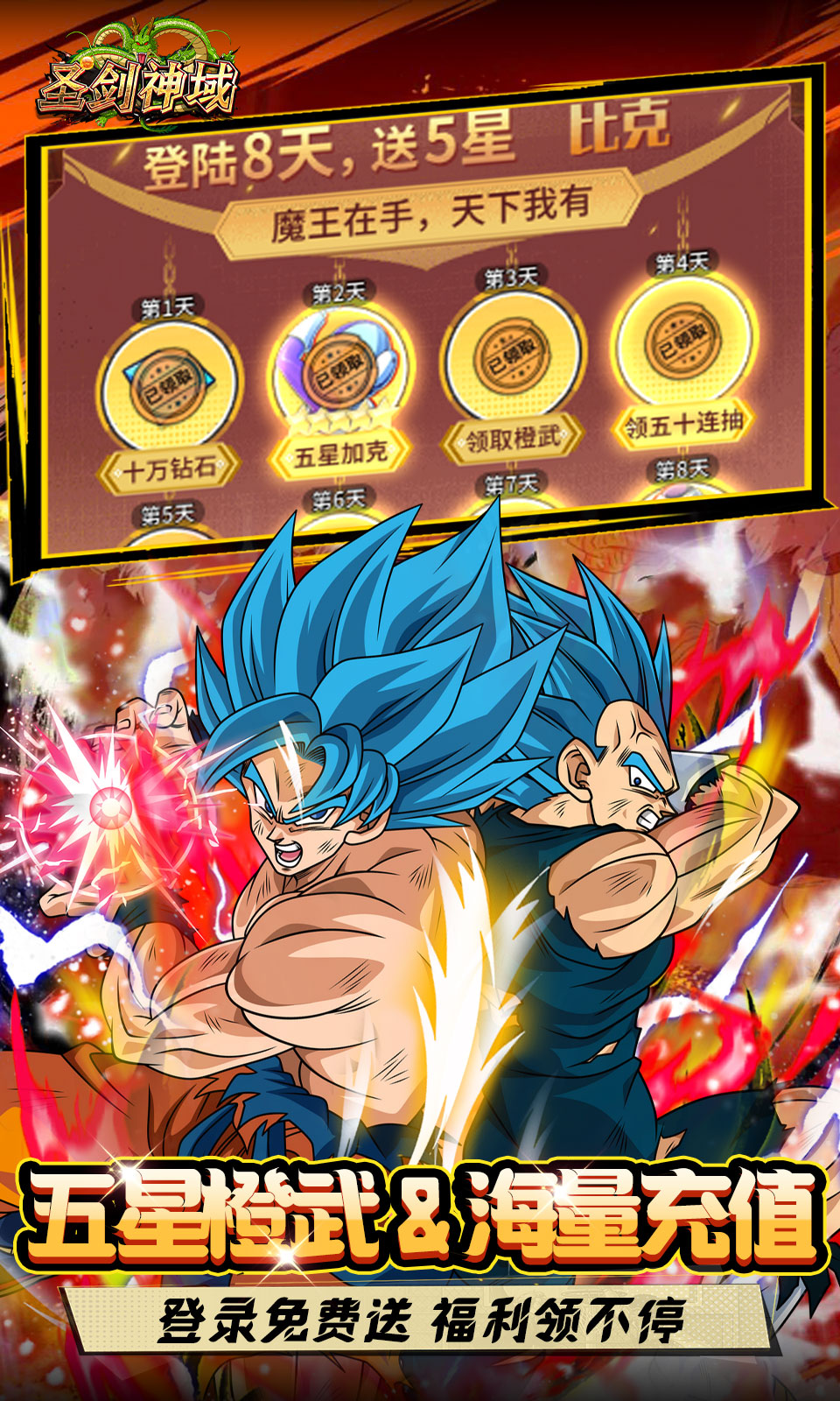 1、游戏内永久0.1折充值,648元秒变6.48元,全民皆可当大佬~~~!2、八日登陆送:五十连抽+五星比克大魔王+超强橙武+海量钻石,开局即起飞!3、签到领海量充值卡,福利加倍,白嫖到爽!!!4、游戏内闯关再送:海量五星英雄+全套红装,肝帝一样能称王!