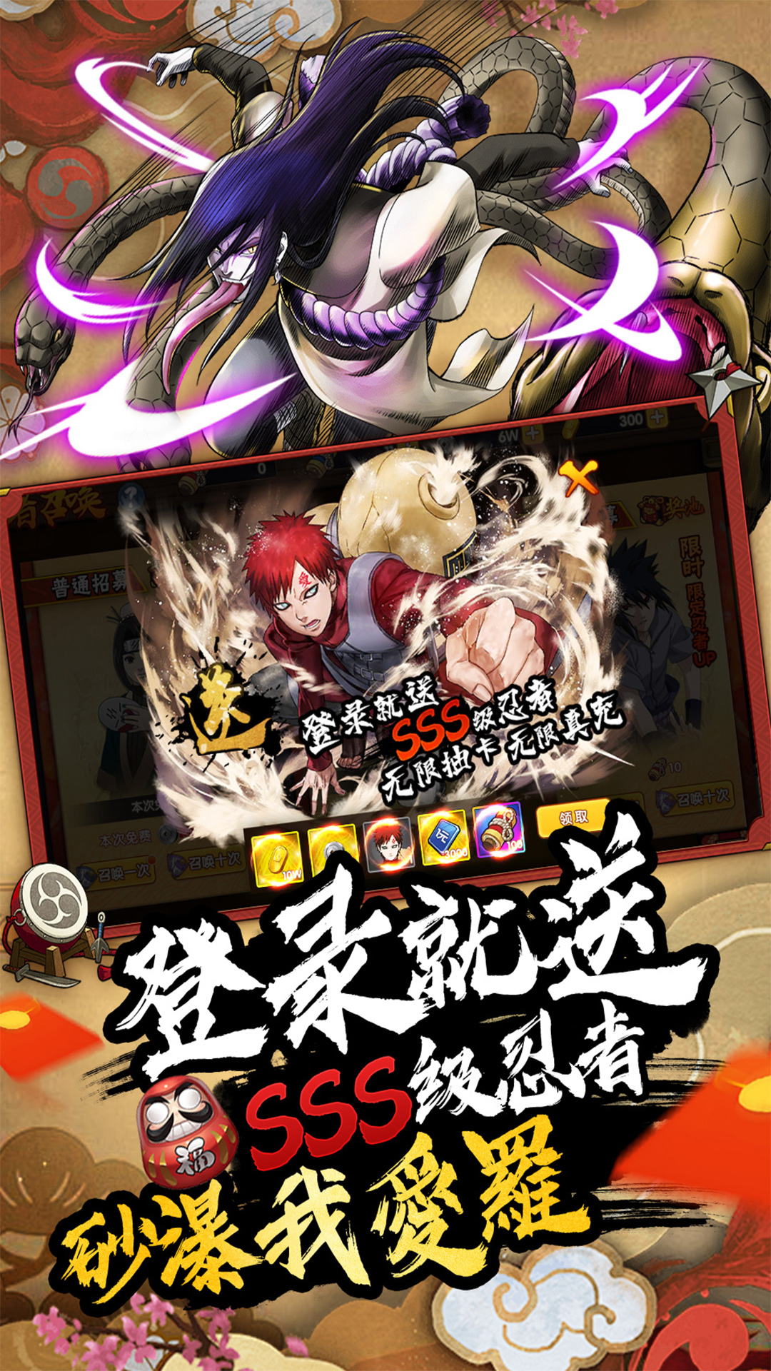 创角即送10W金币,500W银币。超人气SSS我爱罗、3000真充卡、百抽限时招募