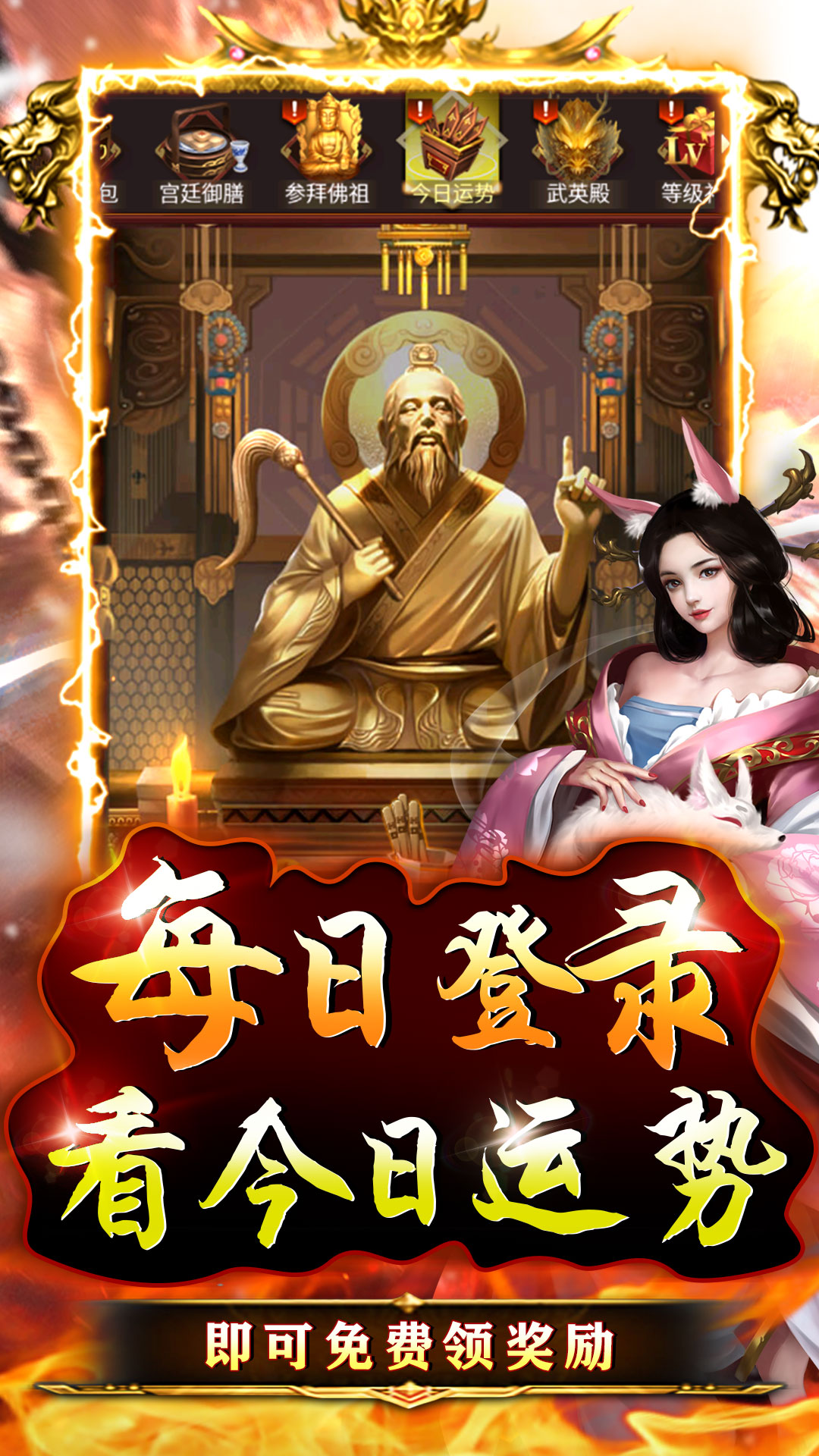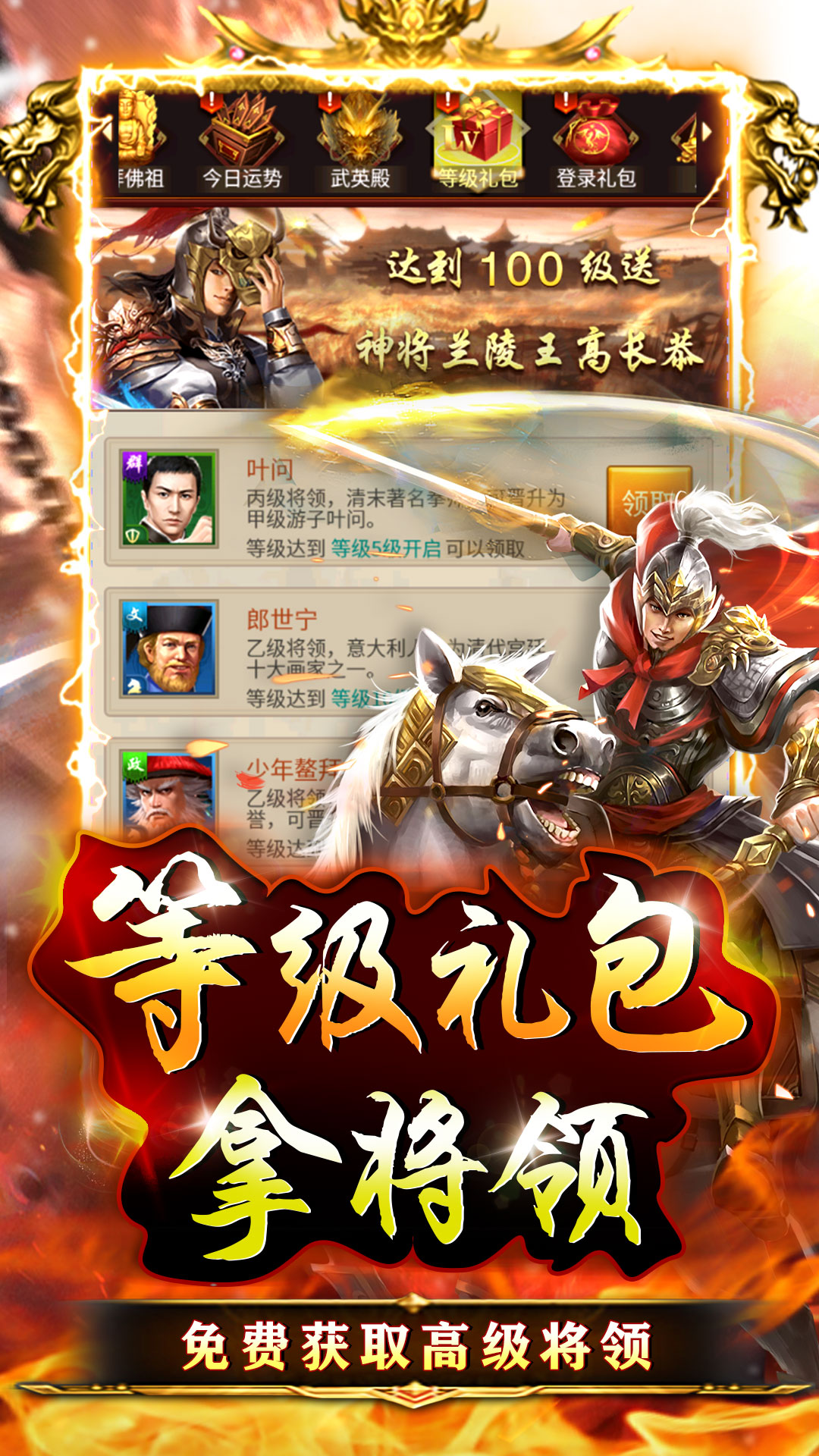 1、等级礼包拿将领,免费拿神级将领2、每日登录看今日运势,奖励免费领!3、武英殿敬香,三战神碎片每周得!4、七日福利送神将,清太宗皇太极免费获取5、挂机幸运抽玩法得丰厚奖励!