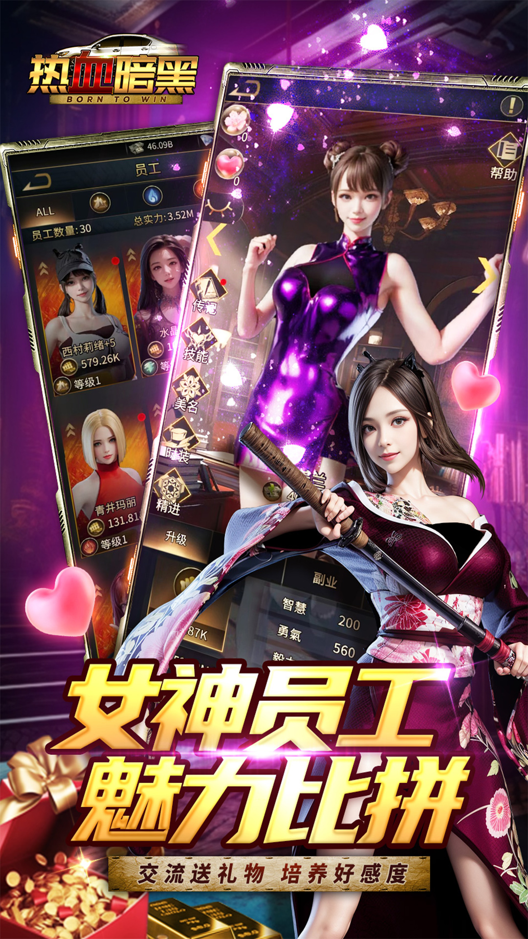 《热血暗黑》是一款现代风格的模拟经营类游戏,在游戏里面玩家将要扮演一名白手起家的创业新手,在小师妹的协助下不断提升自我,增设店铺,扩大版图,逐步体验成为成功人士的过程。游戏具备十分丰富的养成系统,此外还有赛车收集、秘书交流和众多趣味小游戏等您来一一体验