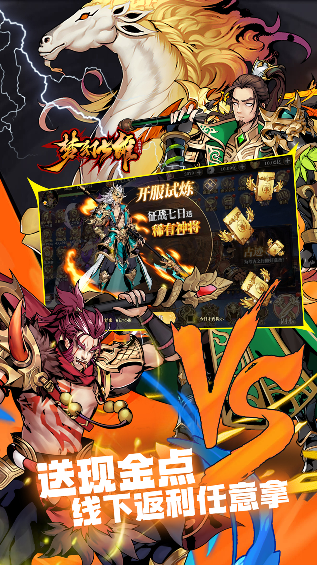 1、天天0.1折,百倍充值福利,平民也当土豪2、创角即送VIP15、极品兵仙韩信*1、1元直充卡*648、元宝*188w,银两*888w3、无门槛免费刷充,首充、基金、无限资源等统统一键免费激活4、百万真充免费送,可激活游戏内累充活动,战力秒起飞