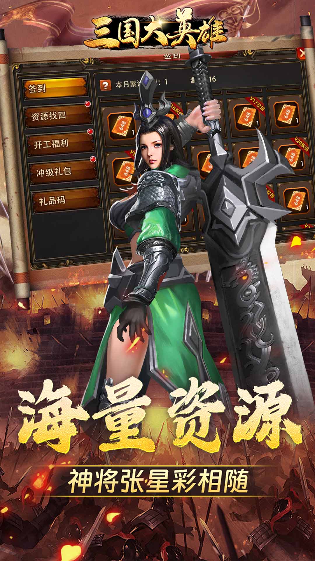 ★游戏内所有充值档位,全部0.1折★登录就送神将张星彩+玄冥狂狮★登陆即送豪礼,每天送豪华福利…… 元宝、武将、培养资源通通送!★充值648元仅需6.48元!