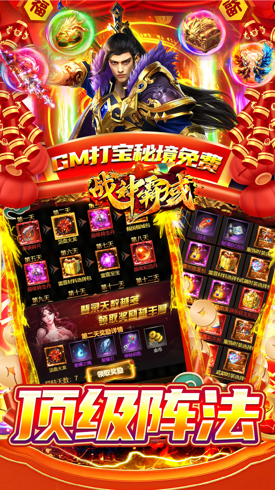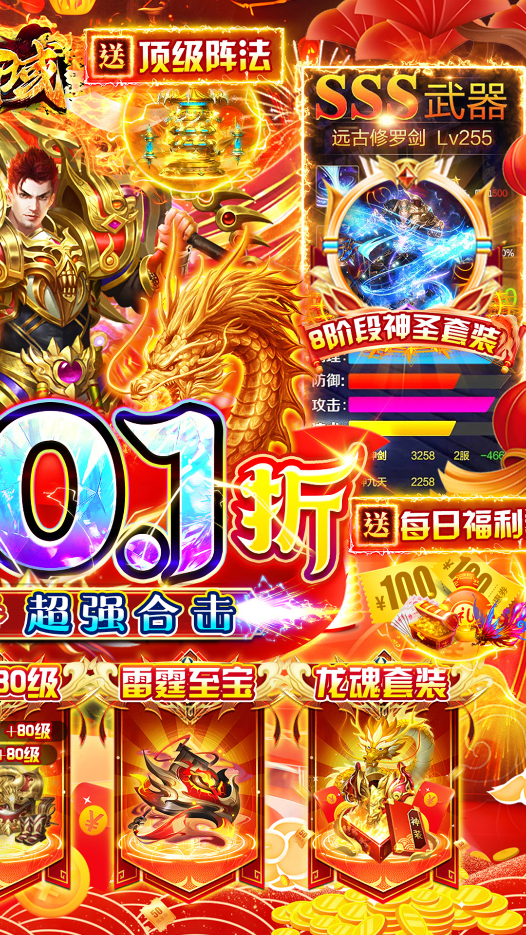 《战神霸域》全新龙年合击版本,充值永久0.1折,上线直升80级+合击符文套装+雷霆至宝+8阶神圣套;还有至尊福利号,终身可领福利券,每日至少648起;免费打宝获得顶级法阵,登录次日领战灵幻形浴血火龙,还有雷霆至宝,高级秘籍可领,全场充值0.1折,数值不膨胀,福利超级多!