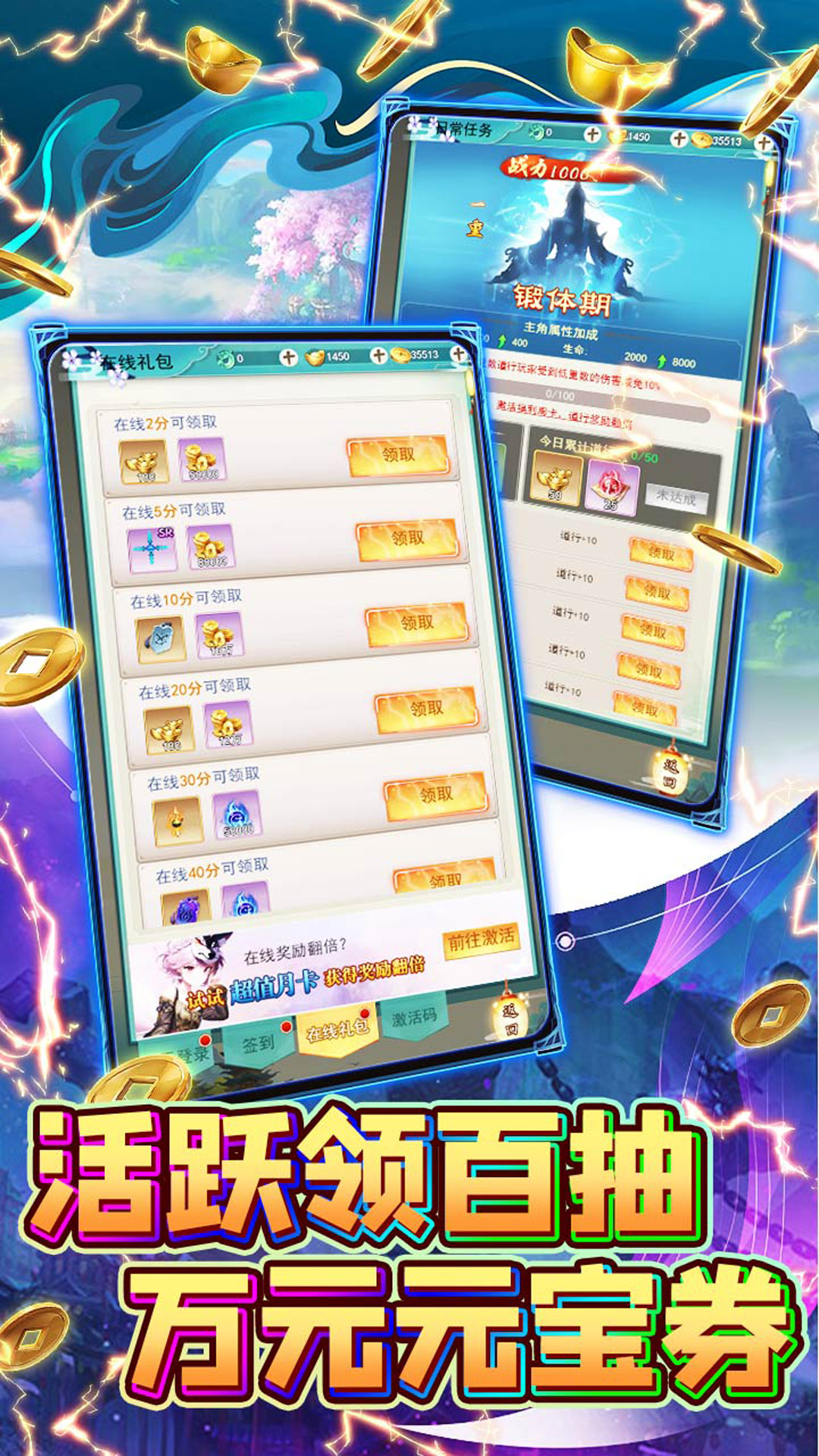 首登领好礼:送SVIP10、648元充值卡,SR极品时装、超级经验丹*5200天天上百抽:在线活跃度直接领百抽万元元宝券:每日登录领取一份元宝券,共计领万元七日送福利:前七日登录可领取大量材料,第七日直领SSR极品时装累签领仙玉:每日签到可领取不同的道具材料,累签规定天数还可领取仙玉