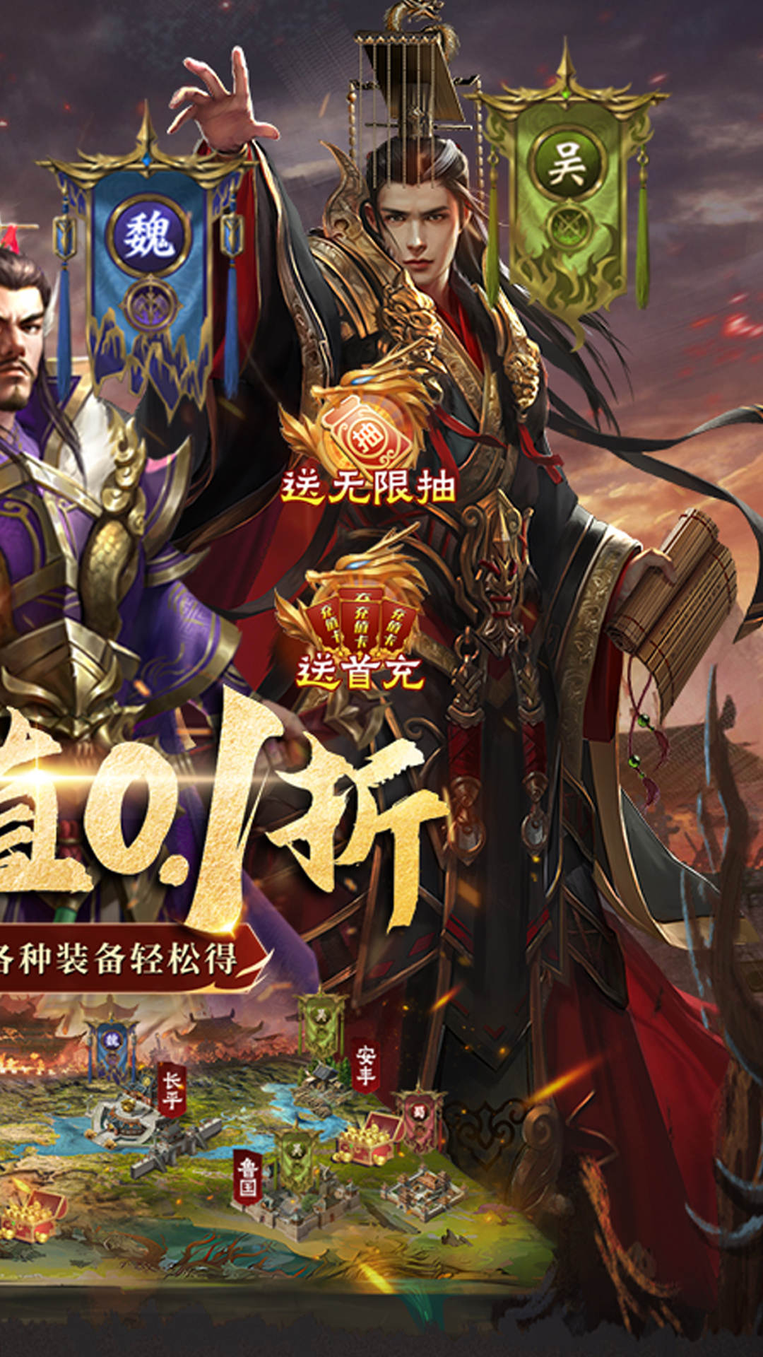 一款全新三国策略手游。还原三国战争场景,告别粗暴数值对撞,体验丰富策略玩法!不限国家自由搭配武将,提供组建一个全将有用的策略空间!三国乱世,群雄逐鹿,大战在即之时,佛系种田或是狼系掠夺?兵临城下,排兵布阵,集众联盟以御强敌!招募武将谋士,助力问鼎天下!大兴科技城建,增进实力,攻城掠地!不拟真三国沙盘,各路名将集结,搭配多变战法,克制兵种,以少胜多。上线即送满V,GM1.顶级红将吕布,GM刷充特权,首充、月卡、无限资源基金全部免费送,每天上线开宝箱,极品红武轻松得,推图征战送真充,一直推图一直送,天天可换真充卡,保持每天登陆还能获得一万神石和二十万真充。登录2天送顶级红将周瑜,登录8天送顶级红将许褚。每天送10次豪华宴请,神将无限抽。