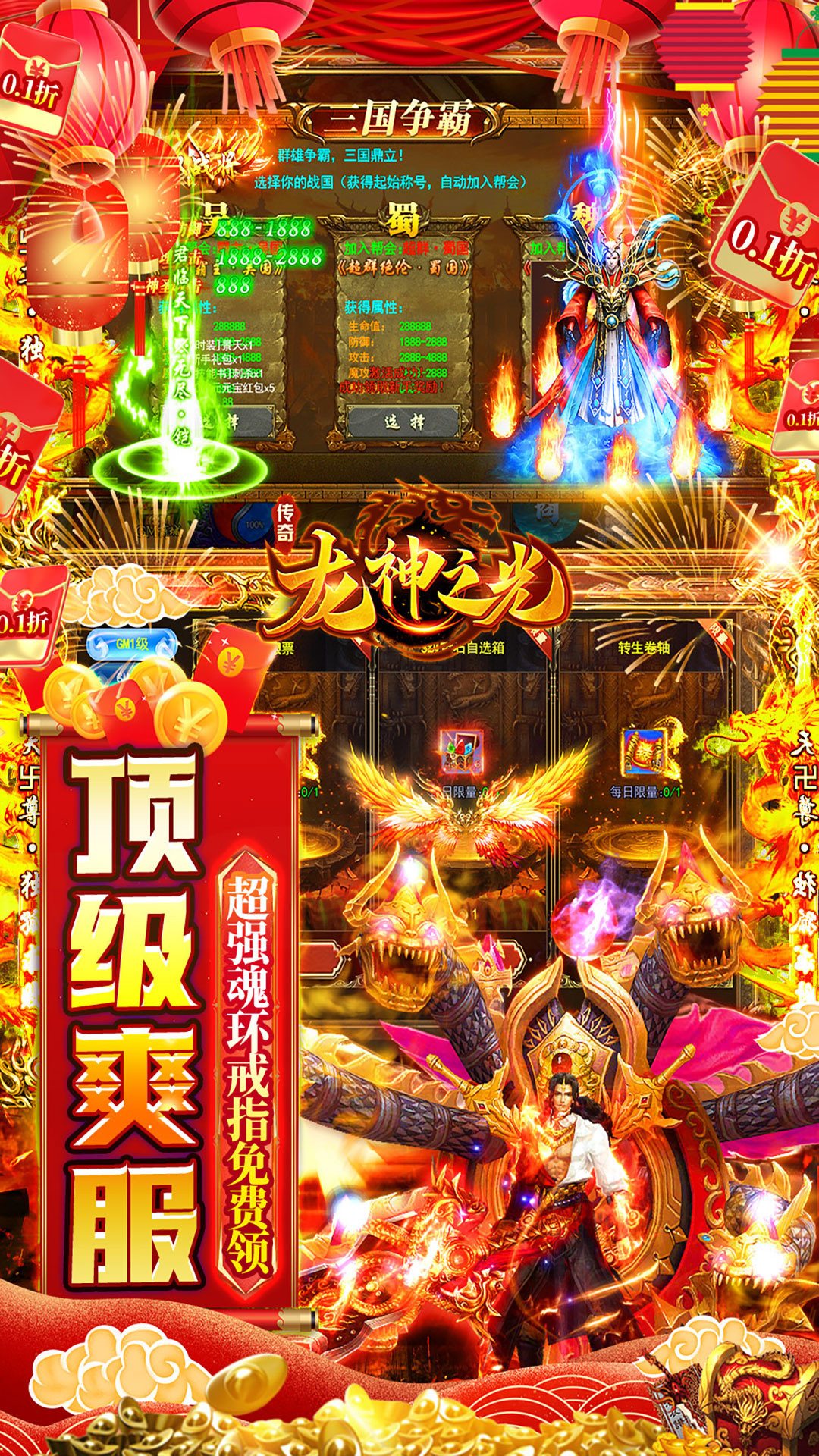 全新三国传奇,全场充值永久0.1折,开局自选国家;上线就送5000元红包和新手大礼包,使用可得元宝100万,十阶剑甲;还有刺杀技能。登录送内玩魂环还有麻痹戒指和切割戒指。专属实物回收,获取大量货币,无限打金!超强版本升级,版本福利拉满,顶级爽服,错过后悔一年!