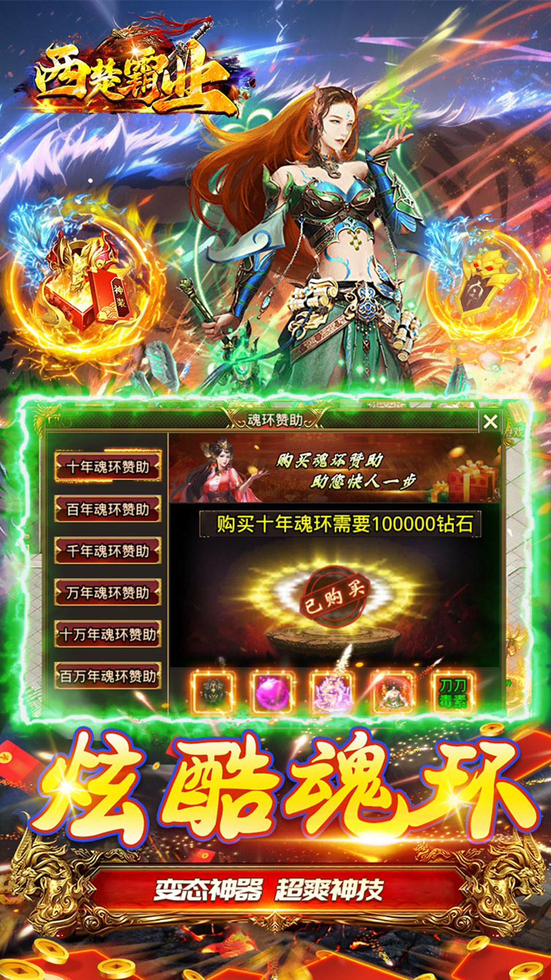 《西楚霸业(0.1折高爆魂环打金)》是一款0.1折魂环神器传奇手游!上线领好礼,签到送充值,轻松又好玩!攻速拉满,刀刀切割怪物,装备材料货币全爆,一身终极不是梦!活动多,大陆多,地图多,地图内设充值福利怪,打到就是赚到!叹为观止的打金速度,震撼眼球的华丽特效,满地金光的爆率!玩法简单易上手,发育快长久又耐玩,邀您下载,一起征战传奇世界!