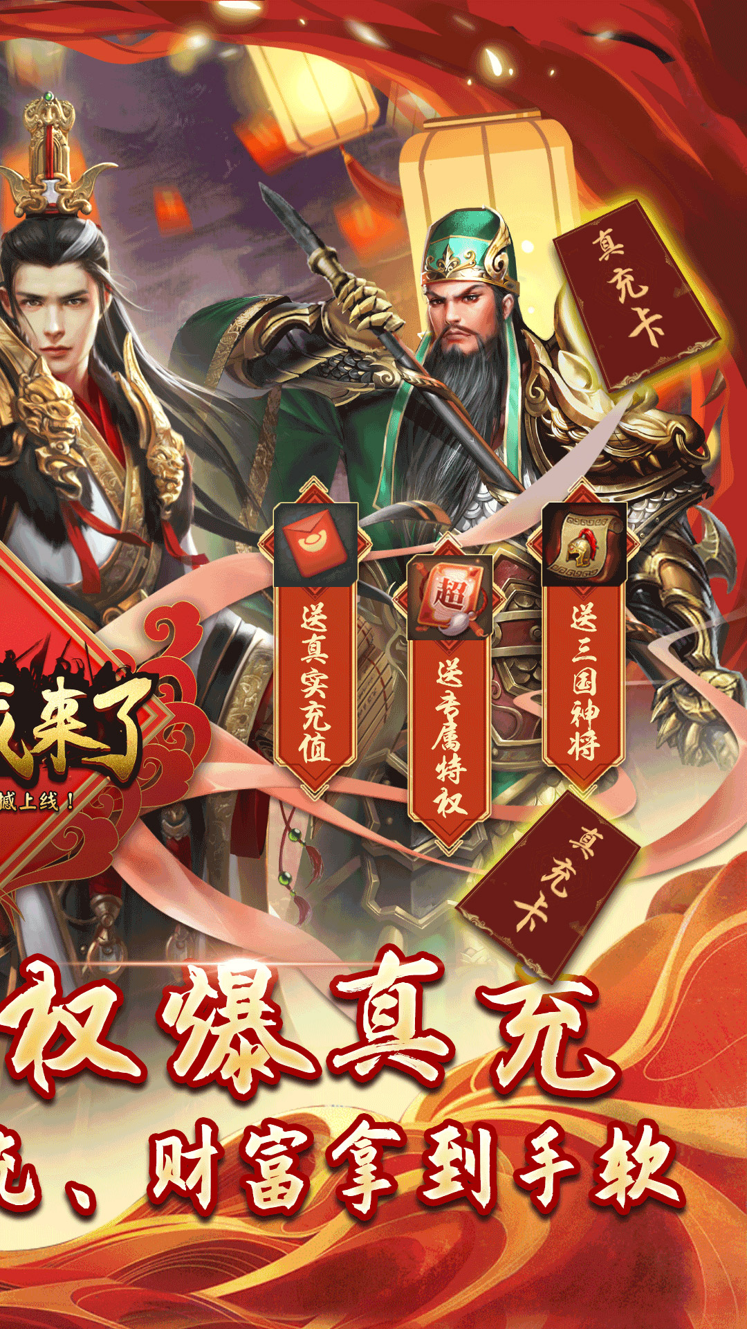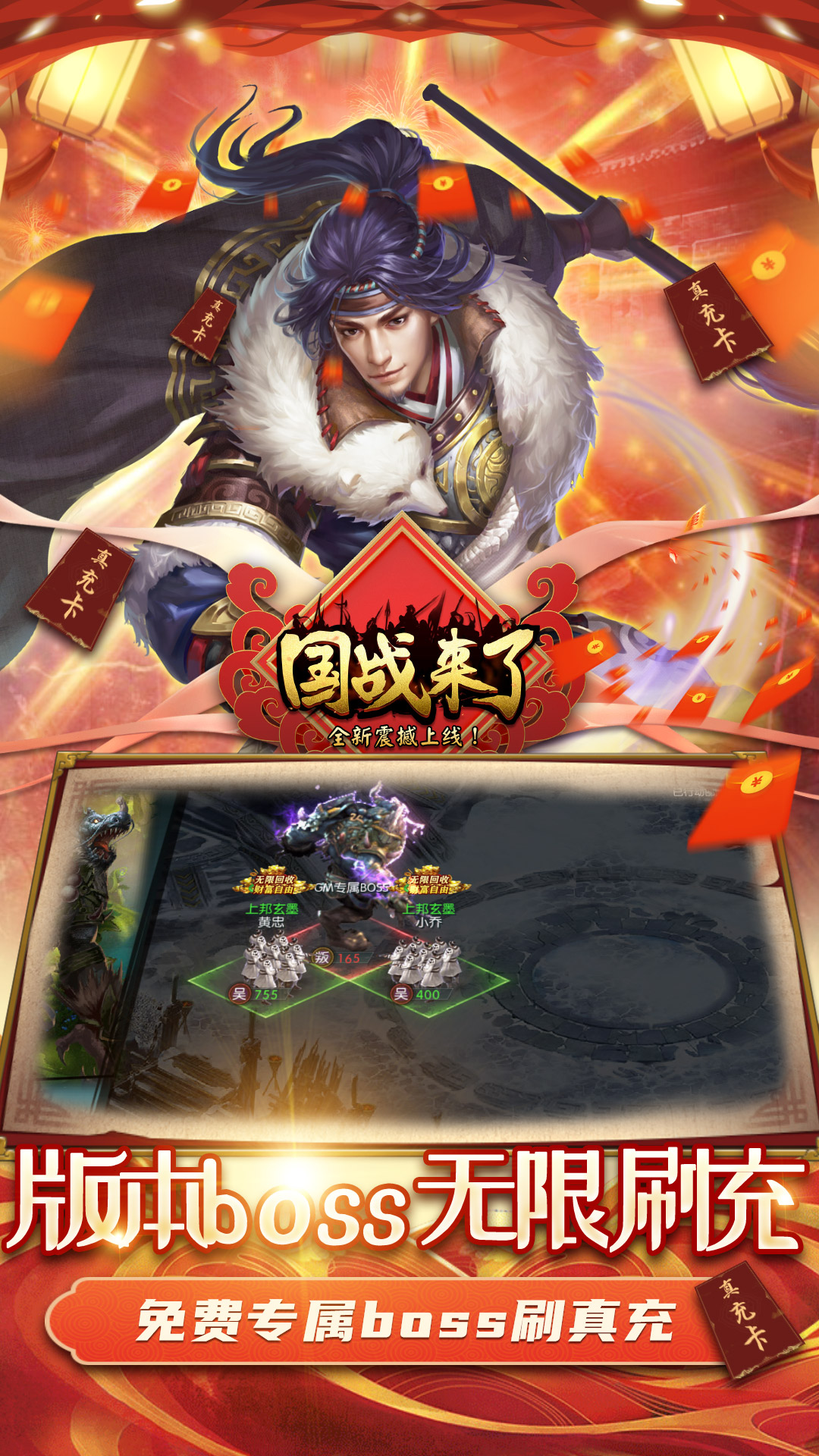 《国战来了(高返无限真充)》全新高返版震撼上线!!这是款超燃三国题材策略大作,最完美还原三国战场激战场面,体验最真实的三国争霸。上线福利一样不能少,开局GM21+海量资源安排,创角送专属特权,直接挑战boss爆真充卡,升级再领真充卡,使用激活游戏累充活动。在游戏中体验,你将置身于三国战场、集合三国各大名将,高还原场景,玩法丰富,游戏中赛季制“天下布武”玩法让玩家不再孤军奋战。各种技能组合、大招秒杀,体验前所未有的打击快感,作为福利最强版本,力求为玩家打造一款福利真实、激情耐玩的三国策略手游!!