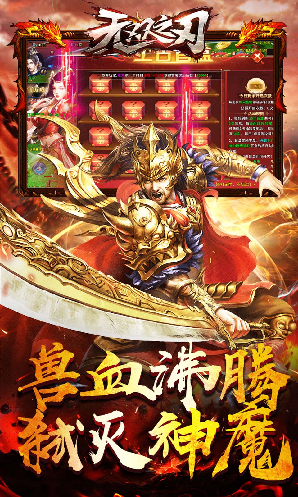 1、上线必送开天斩、逐日剑法、大量真充币、红包等你拿!2、神魔坠世!万族征伐!3、超丰富体验,长久耐玩,持久回忆!4、不死狂神,巅峰一战!5、只有战死的狂神,而没有认输的狂神!