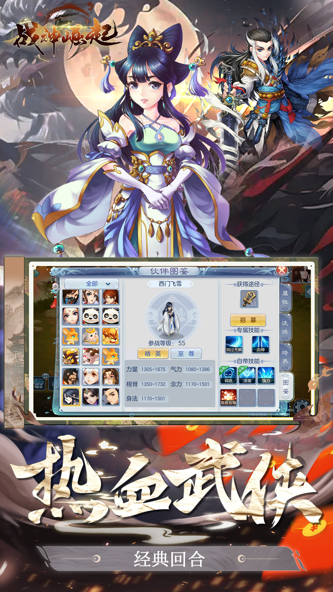 《战神崛起》是一款经典武侠回合巨作,版本上线送神兽和海量元宝,每日登录再送充值。经典的回合制策略玩法,激情回合对战。各大门派广收门徒,发展壮大。侠士们行侠天下,笑傲江湖,江湖进入了一个黄金时代。赶紧来体验精彩PK之战。
