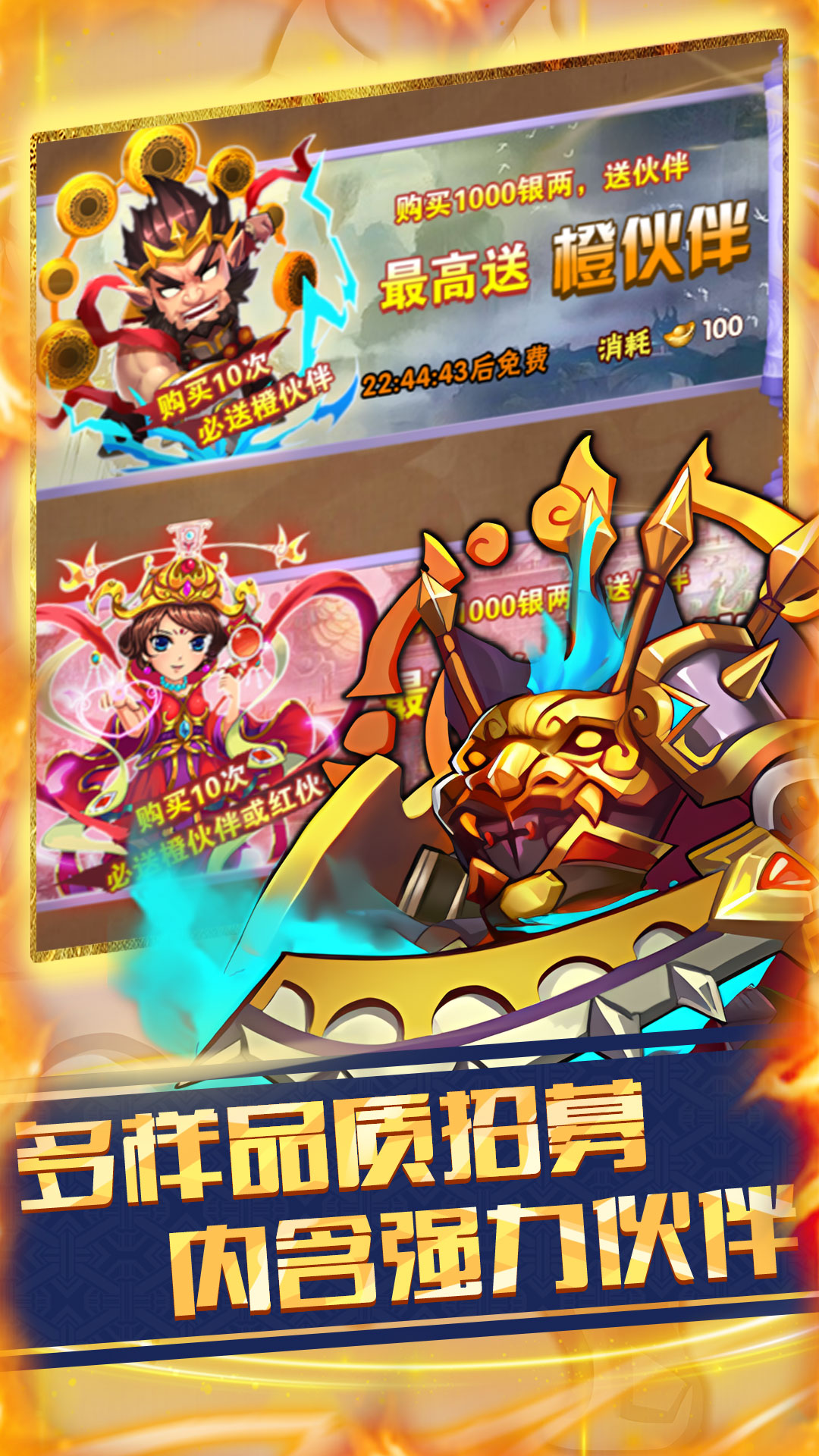 ★登录送大礼,创角十连免费拿超级橙将★签到领豪华奖励,海量元宝、材料免费获取★升级领豪礼,海量招募券、十连招募券等你拿★在线礼包拿珍贵道具、元宝,每日挂机也能高收益