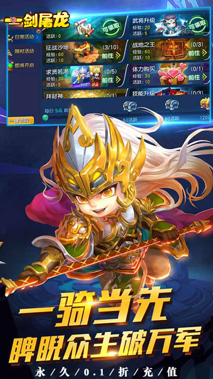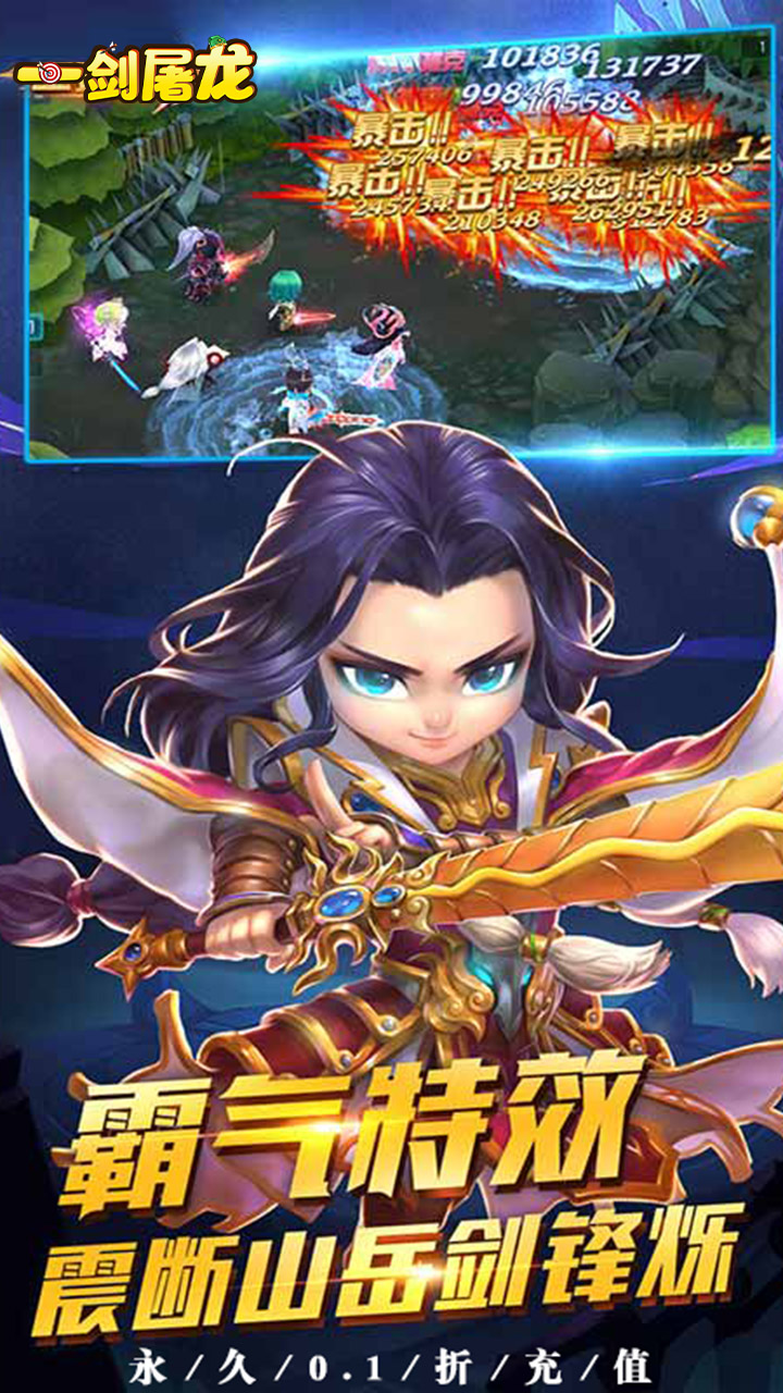 《一剑屠龙(0.1折福利版)》是一款3D回合策略卡牌手游。 游戏再现了关羽、张飞、赵云等经典三国人物英雄,以及虎牢关之战、官渡之战、赤壁之战等经典的历史战场。游戏拥有个性鲜明的时装,国风古韵的场景,绚丽多彩的技能;采用实时PVP玩法,回合策略激爽战斗,排兵布阵精彩对决再现三国乱世风情。战吕布,降群雄,谈笑之间樯橹灰飞烟灭;争虎牢,灭军团,杀敌破阵看三国时代谁主沉浮。