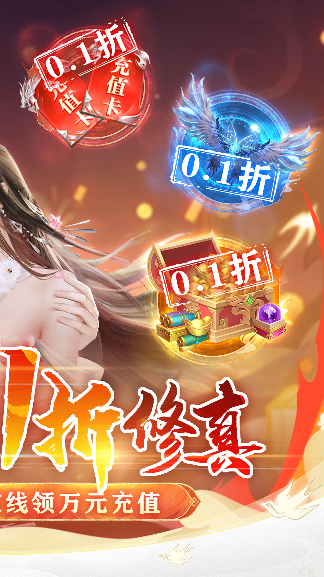 1、创角直升VIP15,在线领取万元充!2、充值全场0.1折,畅爽修仙!3、激爽爆充,每日签到可领取充值卡!4、连续签到,靓丽时装和酷炫坐骑!4、首充领取靓丽时装和绝版坐骑!5、七天登录,绝版称号、时装、坐骑、羽翼全套拿下!