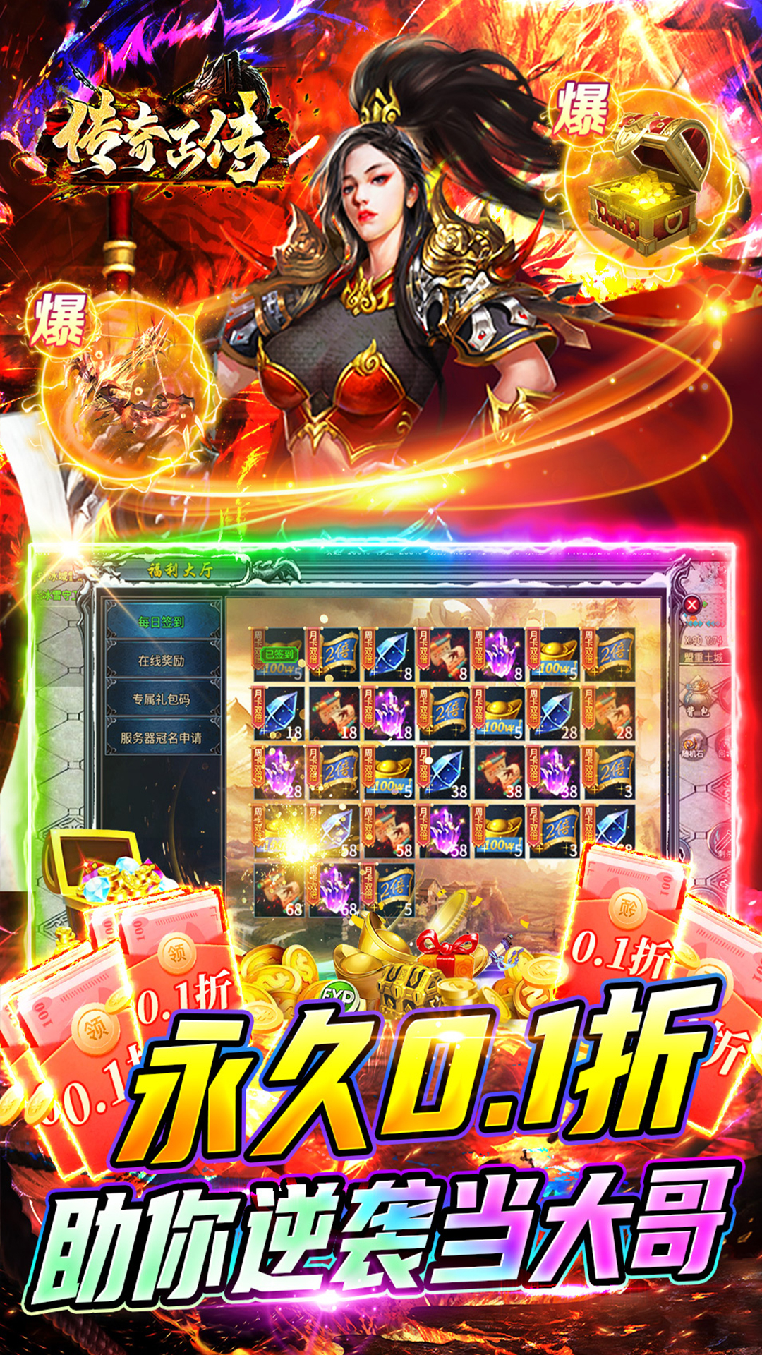 ★游戏永久充值0.1折福利,不限量不膨胀!★登录游戏免费领取10W钻石+500W元宝★每日签到、在线领取大量奖励,BOSS爆真充红包★热血不止,战斗不息,激情跨服,热血皇城!