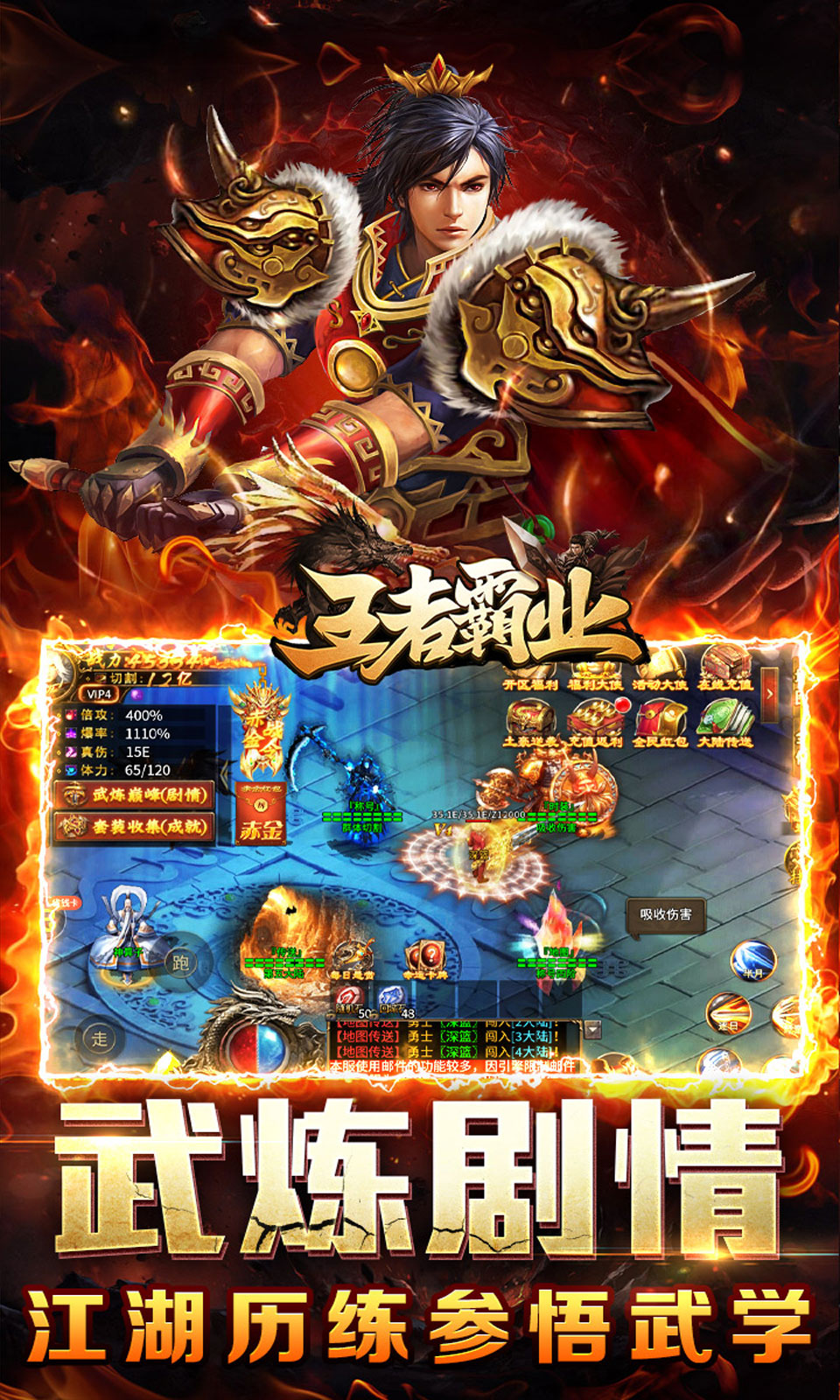 1.上线送等级大礼包、古剑-干将、刀刀带毒、魔法护盾,超值福利领不停!2.充值比例1:1000,充值多倍返利,翅膀福利惊喜礼包!3.每日补给,超值福利奖励,充值返利多到手软!4.武炼巅峰剧情专属任务,江湖历练,参悟武学!5.全民红包,活动一直开,白嫖到爽,五分钟触发一次!6.七日狂欢,每天送充值、送货币、送神兵,干将莫邪鱼肠湛卢!