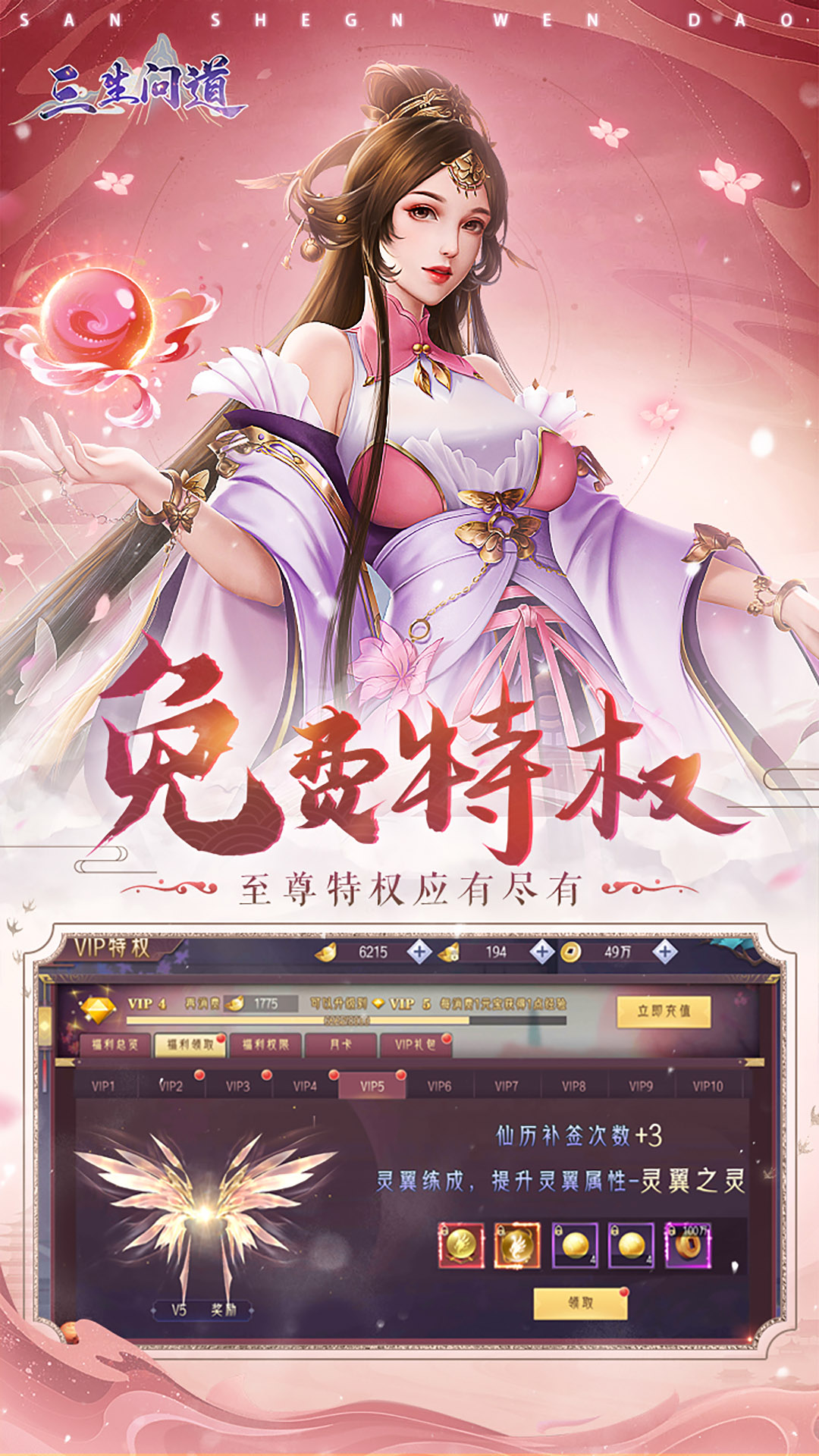三生问道是一款令人陶醉的仙侠角色扮演手游。游戏内设有三种各具特色的角色职业,供玩家自由选择。在游戏中,你将体验到化神、仙宠、坐骑、情缘等多种丰富玩法,让你畅享仙侠世界的无限魅力。精美炫酷的系统时装,让你的角色焕然一新,成为仙侠世界的焦点。与其他玩家结下情缘,共同闯荡江湖,书写属于你们的传奇故事。快来加入三生问道,开启你的仙侠之旅吧!