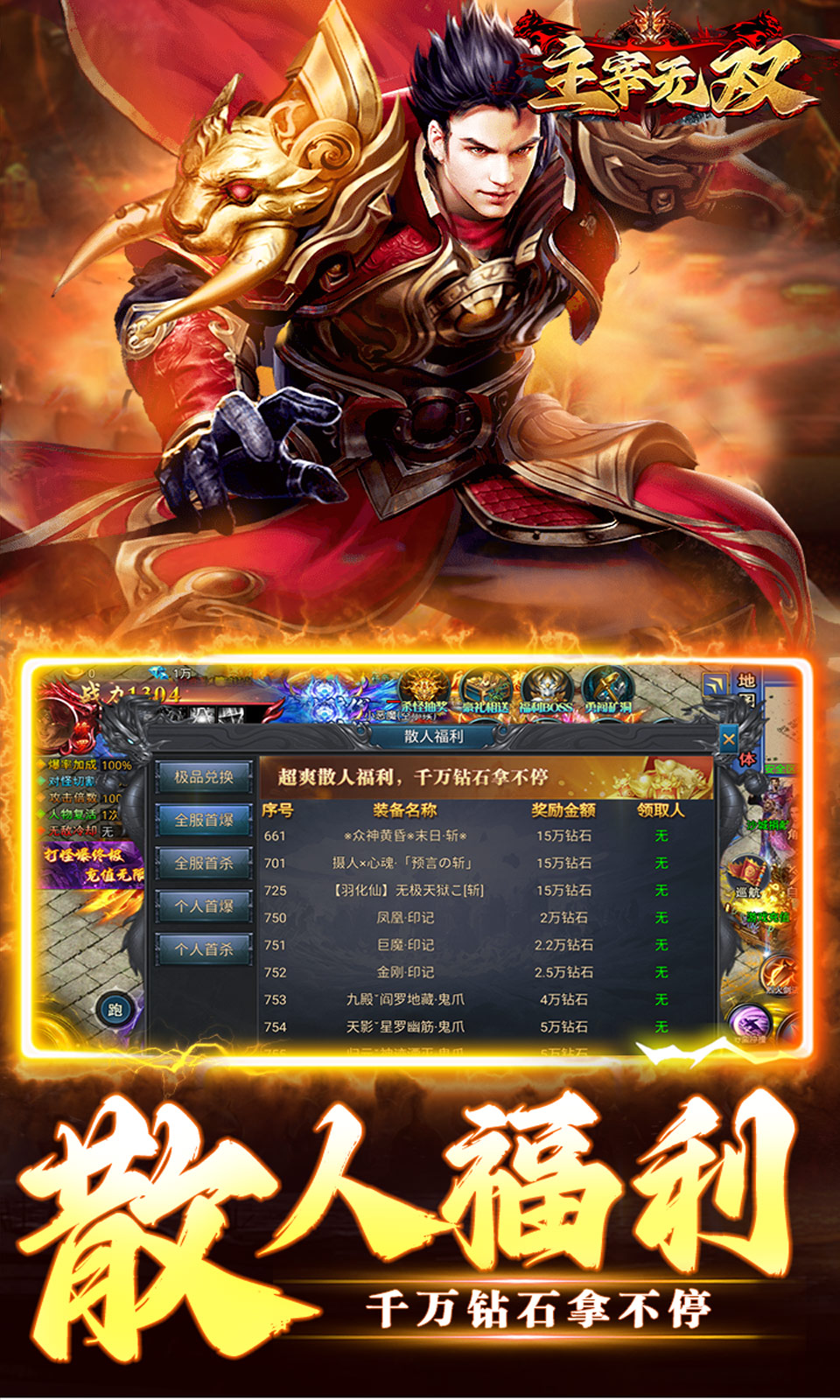 主宰无双(龙年爆款神器)是一款全新超高爆率超变传奇手游,游戏不仅画面绚丽,战斗流畅,更令人振奋的是其丰富的福利系统。新手登录即享自动拾取、自动回收,轻松解放双手!七天签到奖励不断,鸿蒙宝葫,杀戮圣器,祝你一飞冲天。节日庆典活动频繁,参与即可赢取限定时装、强力坐骑,让你的角色独步天下,风采无双!龙年必玩的传奇之旅,海量福利等你来拿,一起开启属于你的神话篇章!