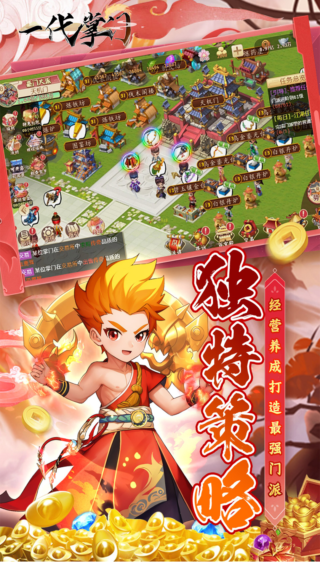 《一代掌门》是一款大型多人同服经营模拟类游戏,您将扮演一位没落的掌门人,当意识到自己的身世后,展开自己重建门派之旅,您将通过招揽各种能人异士为您打造神兵利器,贩卖给武林中人赚取大量金钱,通过招募武侠中的各路豪侠为您开疆扩土,奠定武林地位,在华丽的3D武侠世界中,逐步成为武林至尊!