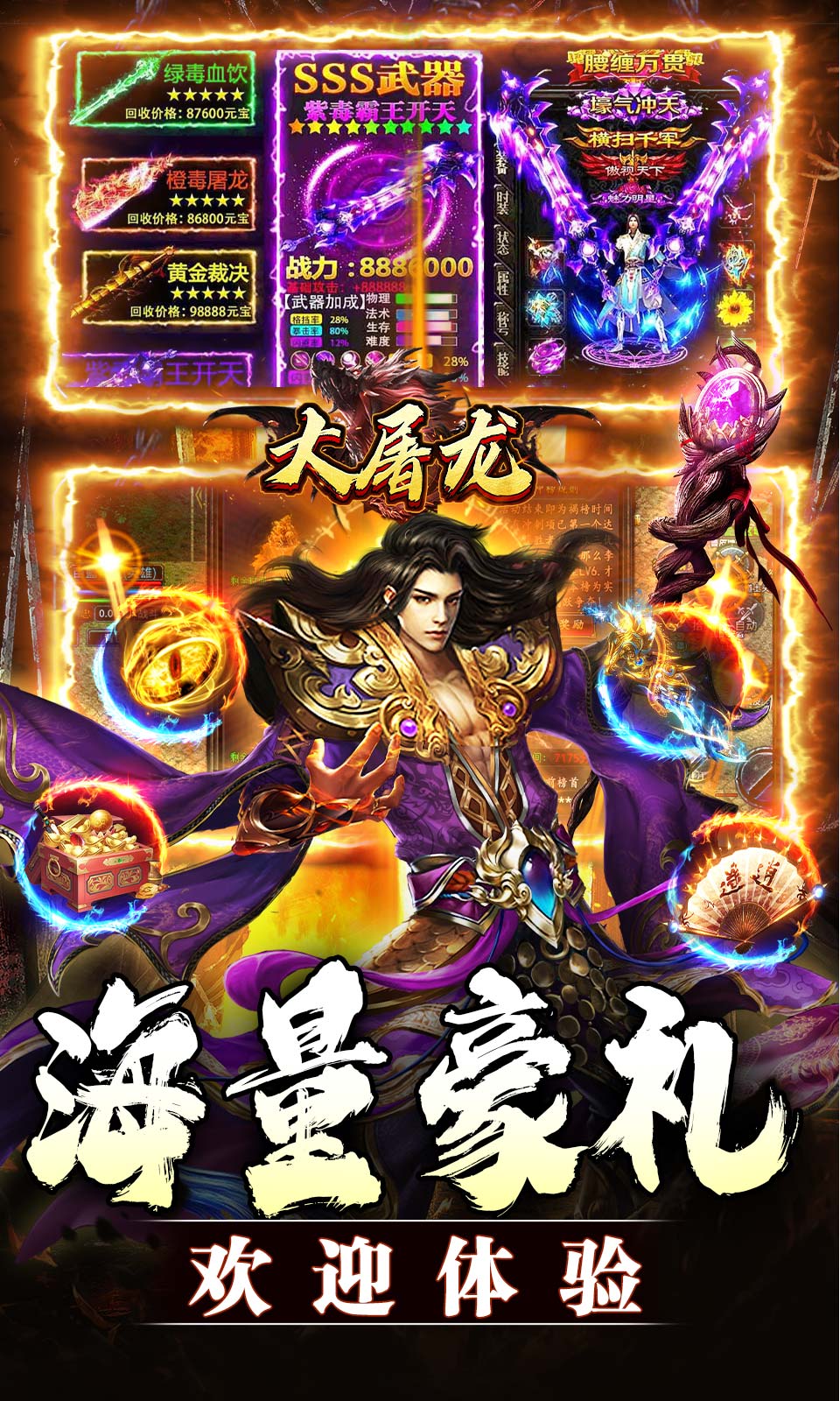1、上线就送:自动回收、范围拾取、超大背包和仓库2、上线就送:满屏特效、万亿切割、砍怪砍人炫炫炫炫炫3、上线就送:商百万首爆、大量红包全服狂送送不停4、PK超激情、流畅、超爽、人人可打终极,白大佬能毕业5、砍怪个个有红包,刀刀砍米将白嫖进行到底