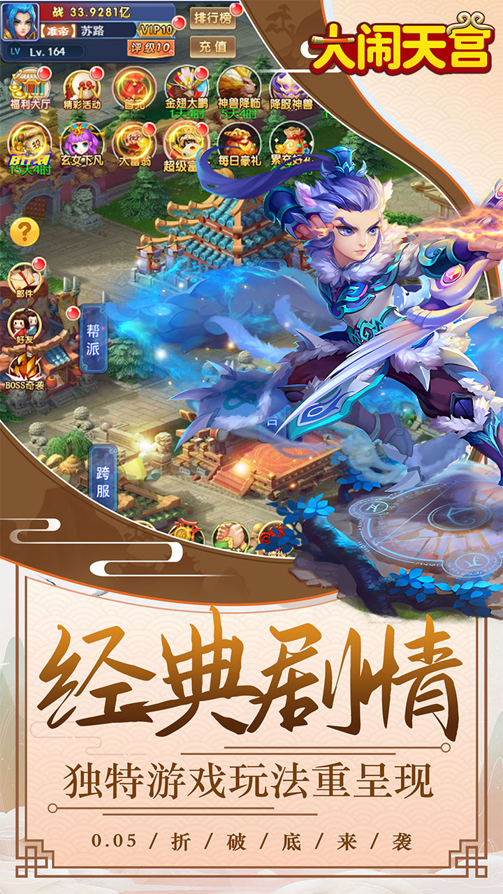 《大闹天宫(0.05折送千亿战力)》是一款Q版回合制游戏。创角即送异界英雄仙童、阎罗王·御灵、仙童元宝*1亿、银两*1亿、绑元*2000万!累计登录还有千亿战力神宠圣·赵云等你拿!精美2DQ版人物设计,搭配西游故事剧情,实力打造精品回合制经典!酷炫坐骑共同遨游天宫,独有万千道具自由回收,多样经典回合玩法无穷乐趣!