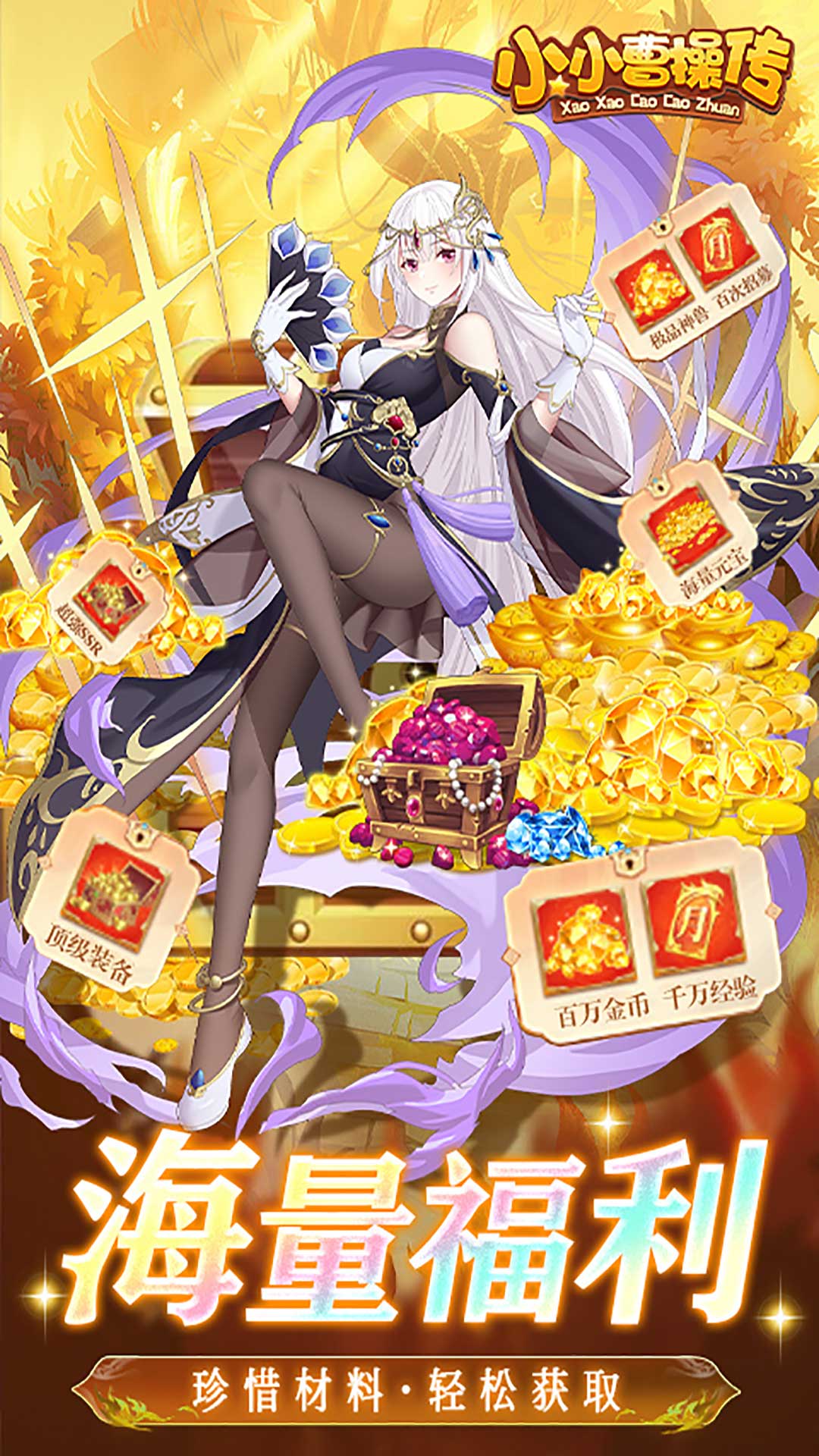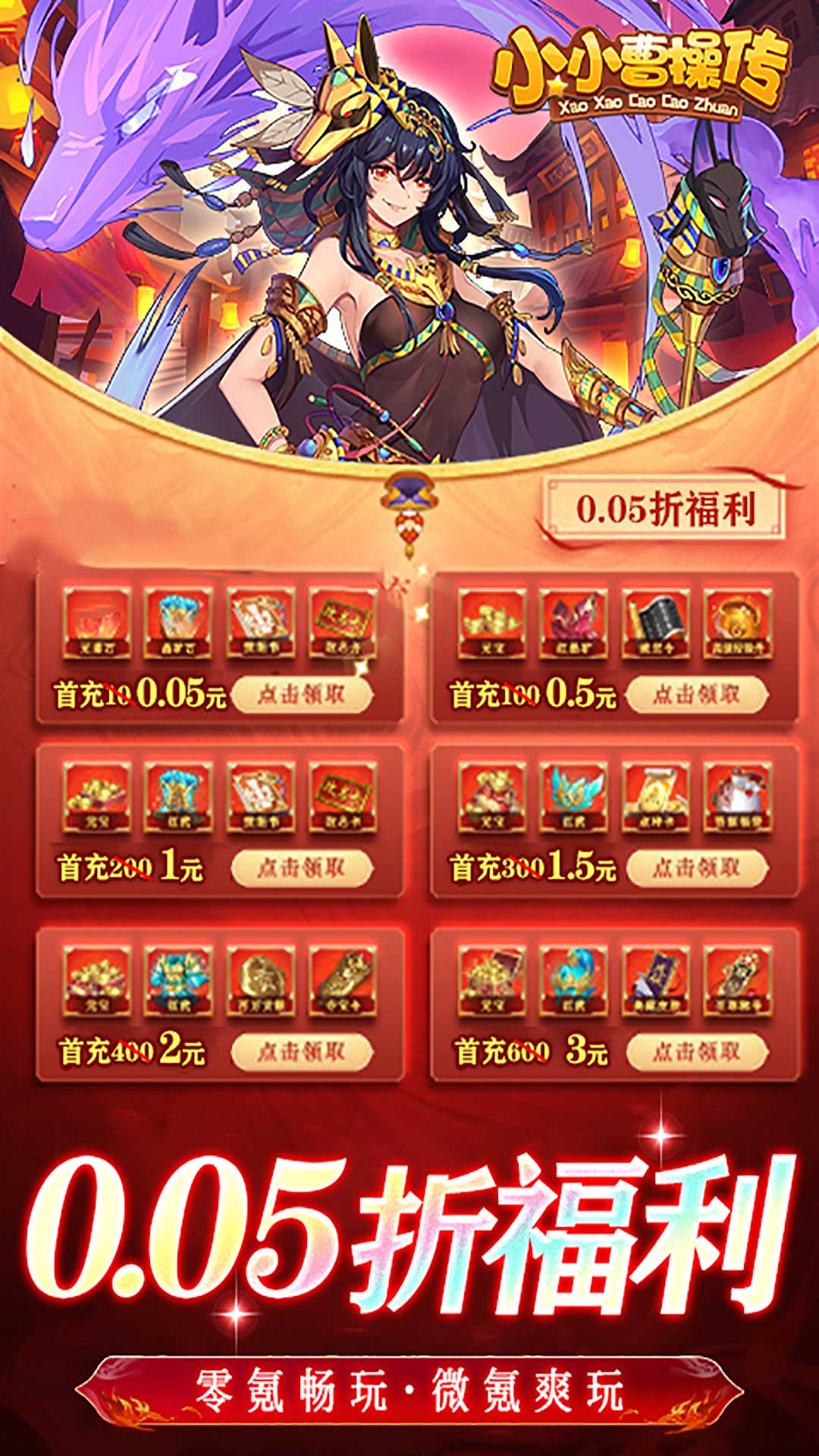 1.充值付费全场0.05折,3元即可拿下648元礼包!2.领取精卫、红孩儿极品神将,连续签到领极品神将武圣关羽!3.闯关送海量资源,神卡免费领充值比例1:10!4.签到领取价值50万元宝奖励!5.月卡、终身卡、至尊卡全部0.05折,最高福利最低价!6.主线通关送无限十连抽,完成任务送神将赵云!