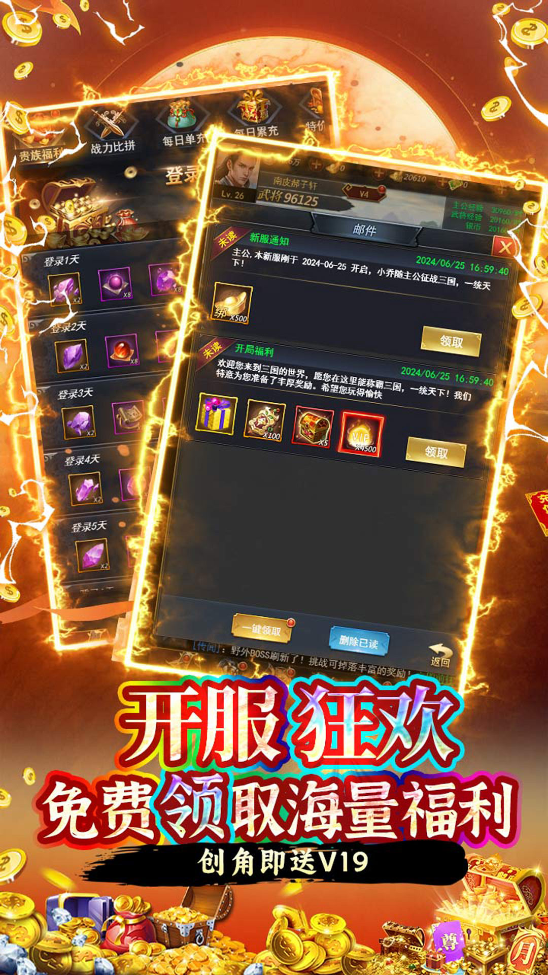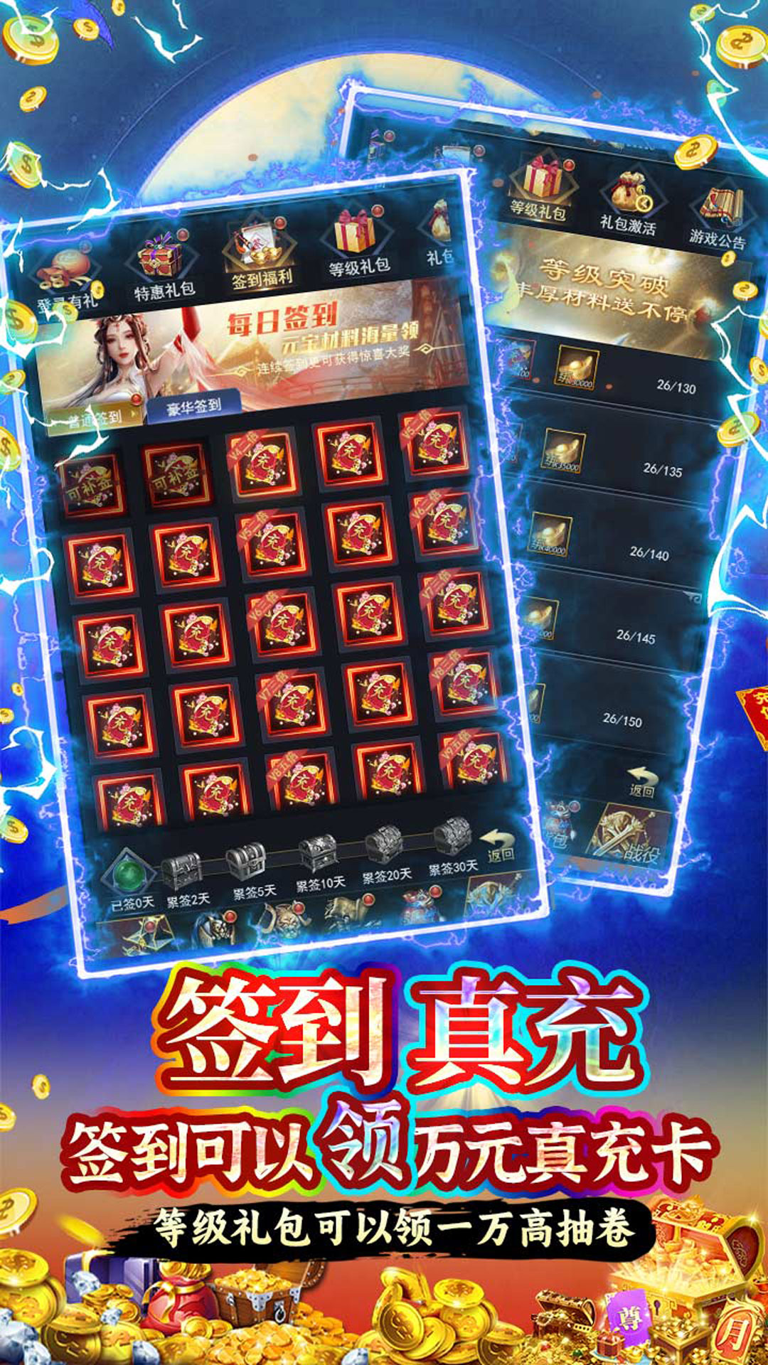 开局送福利:VIP19、顶级自选金将、百抽招募令、神装随机箱(邮箱内领取)每日豪签礼:豪华签到极品奖励任性拿,更有稀有奖励随机发放累登领红将:累积八天送不同红将、海量绑元、天虎装备箱签到领元宝:每日签到直领真充卡,连续签到更有惊喜大奖等级突破礼:升级送材料,丰厚资源送不停