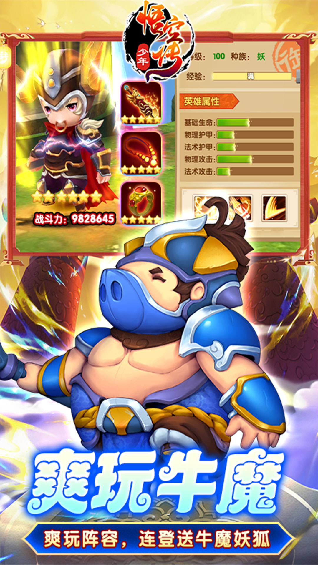 1.神将助力,开局送神将沙僧!2.上线百抽,绝版豪礼全白给!3.爽玩阵容,连登送牛魔妖狐!