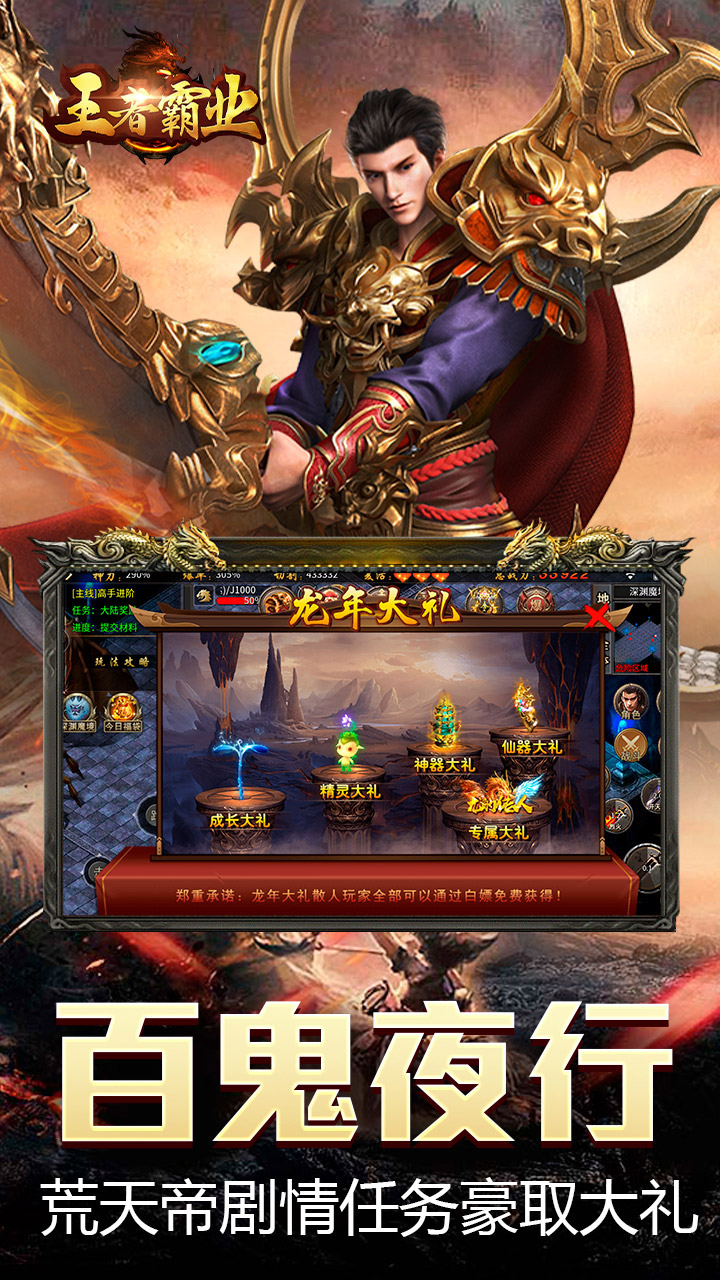 1、上线送足迹、自动回收、自动拾取、游龙印等,超值福利领不停!2、充值比例1:100,超高返利超高爆率,双倍货币充值爽翻天!3、降妖录,荒天帝专属剧情任务,跟随荒天帝平定界海,征战上苍!4、游龙入海似腾飞,百鬼也行钟馗捉鬼大师,七神下界!5、三千道洲,神武专属,神武秘境高爆神武专属装备!6、主宰大陆,上古神兽猛犸象,上古蛟龙坐骑,漫漫传奇无人敌!