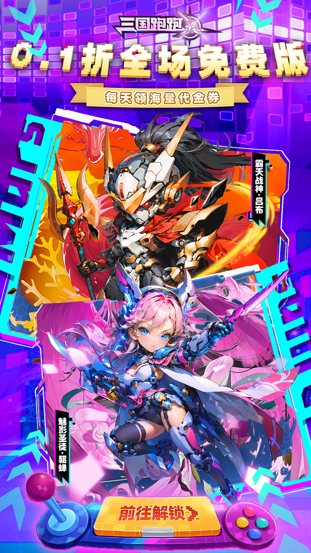 尾缀说明:游戏首次及后续充值都为0.1折,每天登录可领取代金券,即0.1折无双免费版。