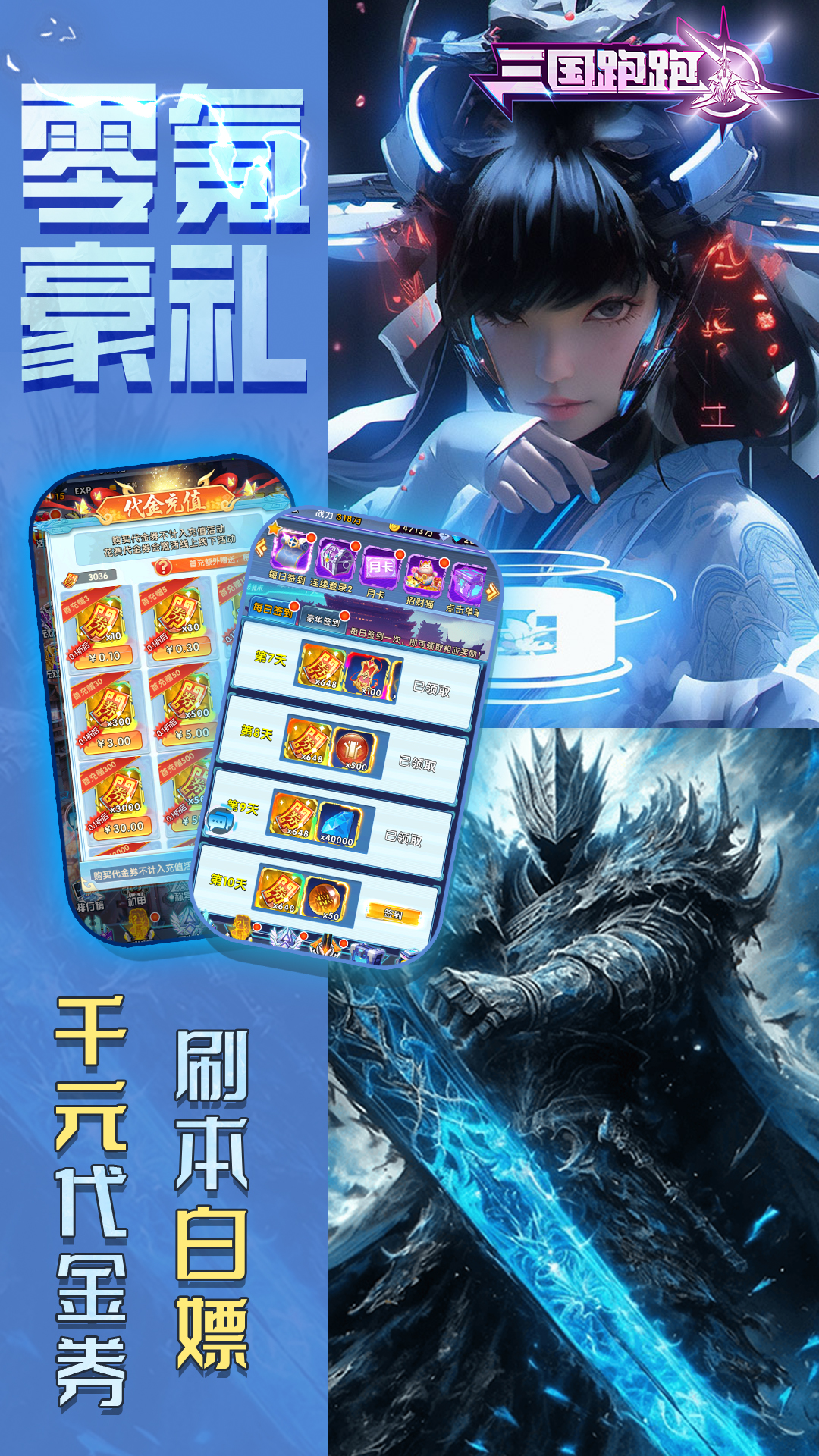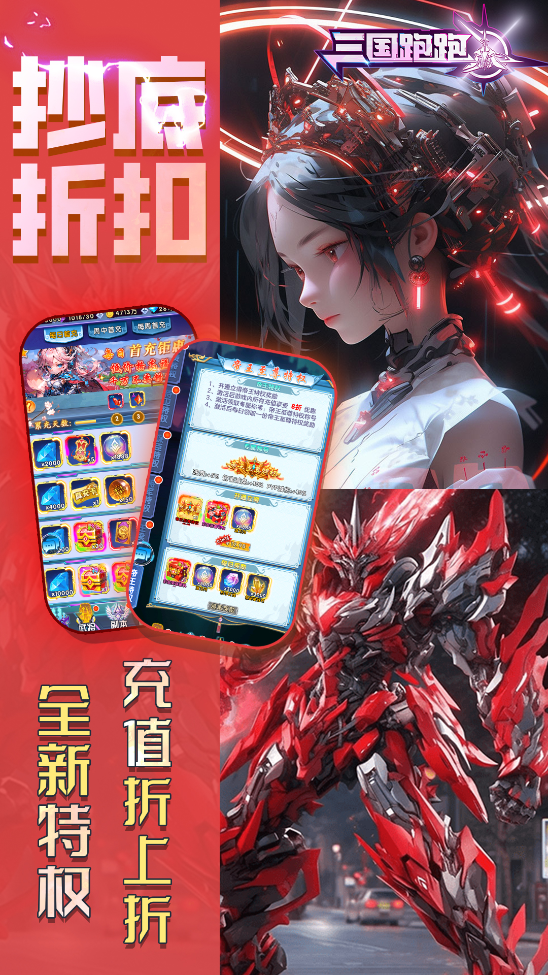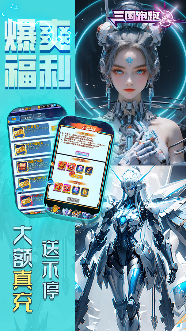 1、送代金券,每日登录领代金券2、全新特权:折扣特权,充值折上折3、刷充:刷副本送代金券,活跃送真充卡4、万元好礼:创角即送万元真充5、在线福利:每天领2000元充值6、免费首充,送彩金神将【关羽】7、全新招募,单抽最高获得神皇级武将