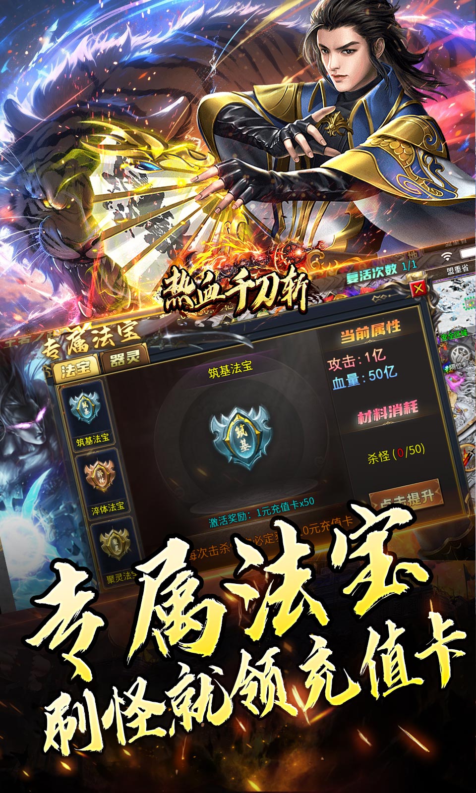 热血千刀斩(专属招财爆亿充)全新专属超变版本传奇,上线直升9999级!爽到起飞!登录领取万亿切割、千倍爆率、范围嘲讽,刷怪效率直接拉满,带你体验光柱爆满地的感觉!王者之路任务指引,杀怪即可领取王者套装以及海量材料!龙魄宝库挂机刷怪即领直购币,惊喜多多,福利满满,带你体验飞一般的感觉!