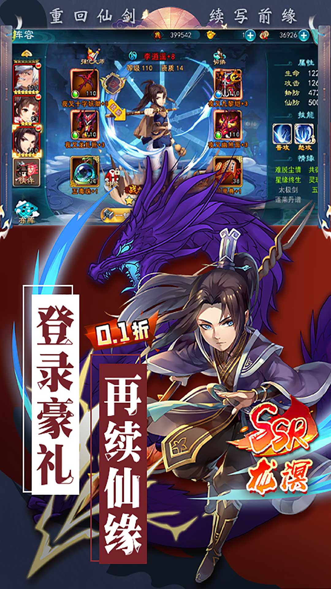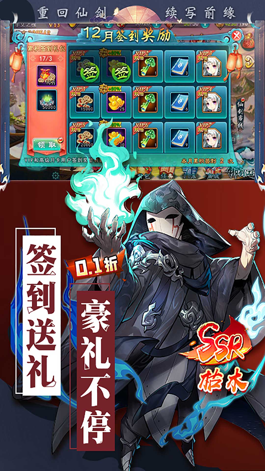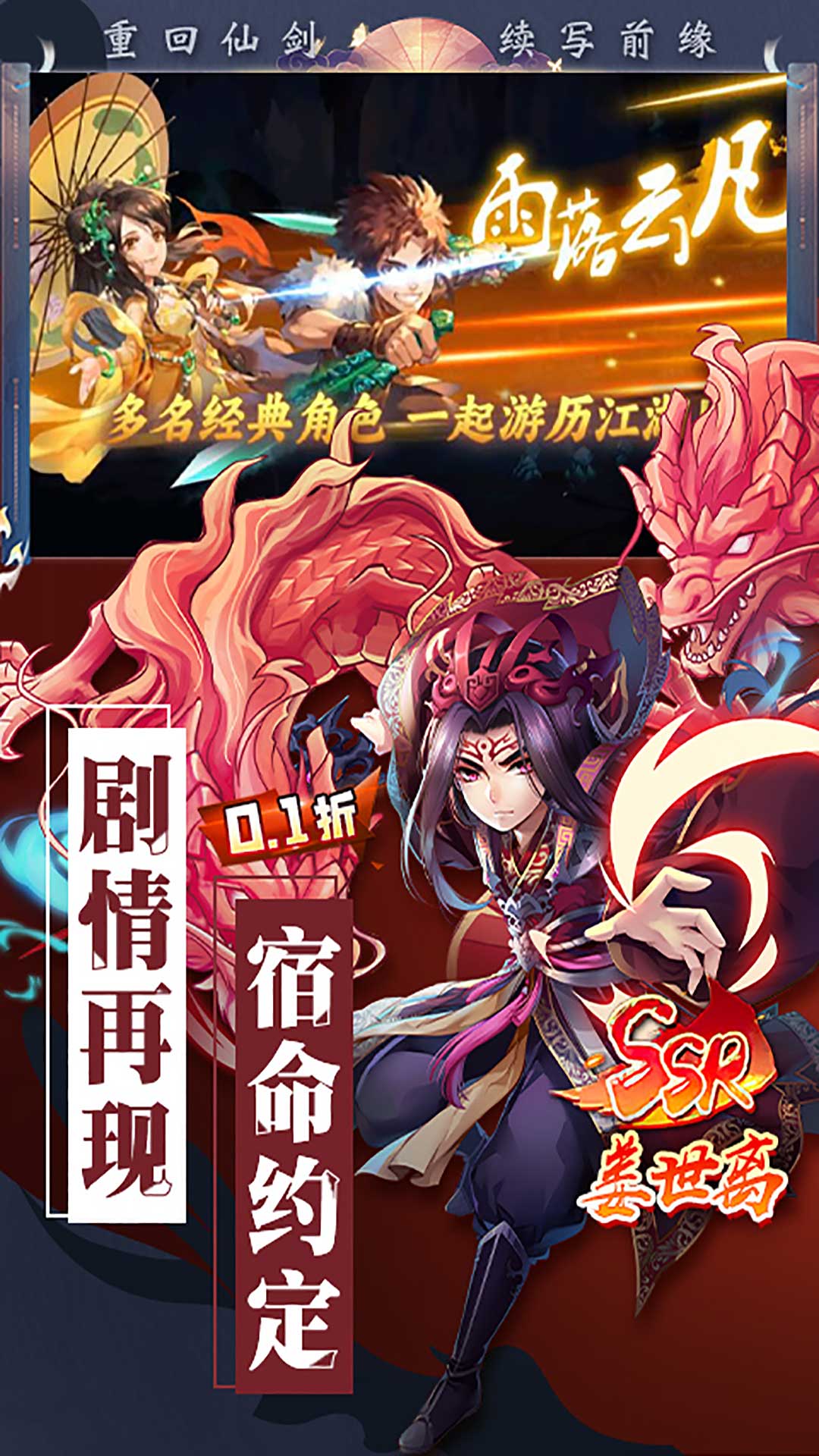 1.上线登录直送VIP6、充值比例1:10,体验快人一步!2.游戏内所有充值全部0.1折,首充仅需0.06元!3.7日豪礼送至尊法宝和超强SSR英雄-龙幽!4.创角即送SSR奶妈英雄唐雨柔和超强组合技-雨落云凡!5.全民狂欢福利拉满,天天送海量培养资源!6.海量活动丰富玩法,带你重新回来仙剑的世界!