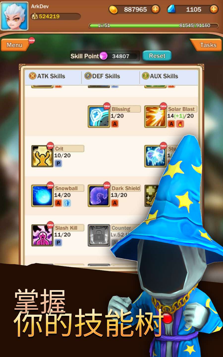 提升角色等级,选择并强化独特技能。