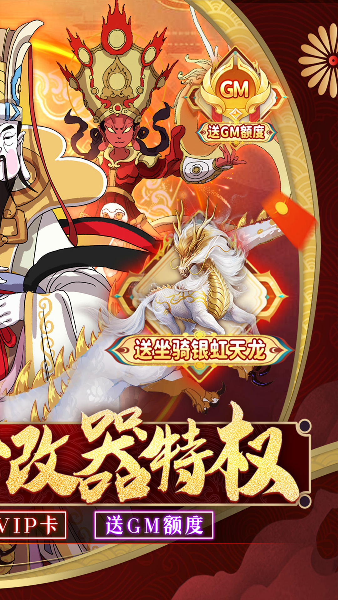 后缀说明:首充续充直购特权统统0.05折,登录即领坐骑银虹天龙,vip卡,GM额度*500,绑元*8888,铜钱*288888