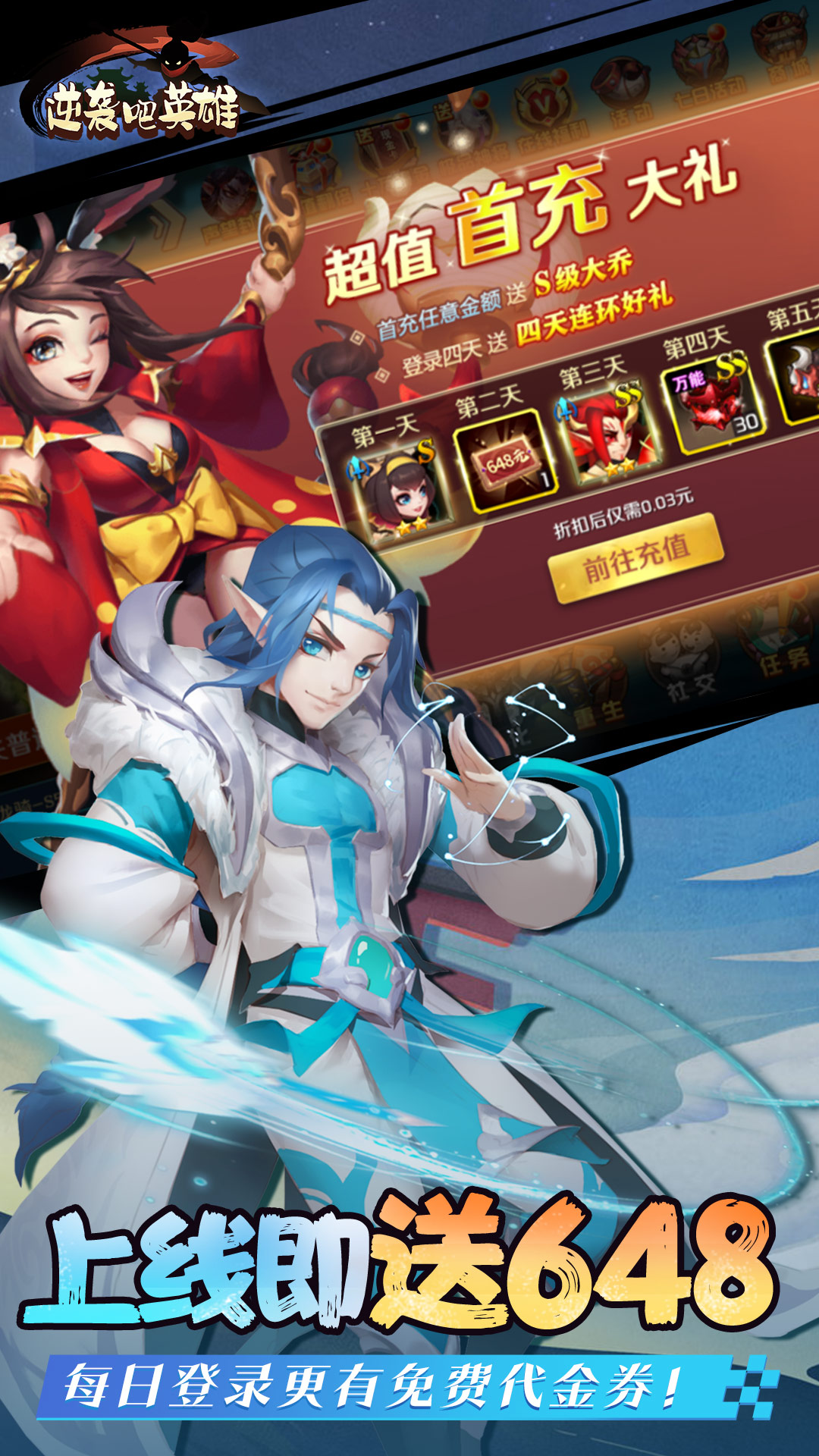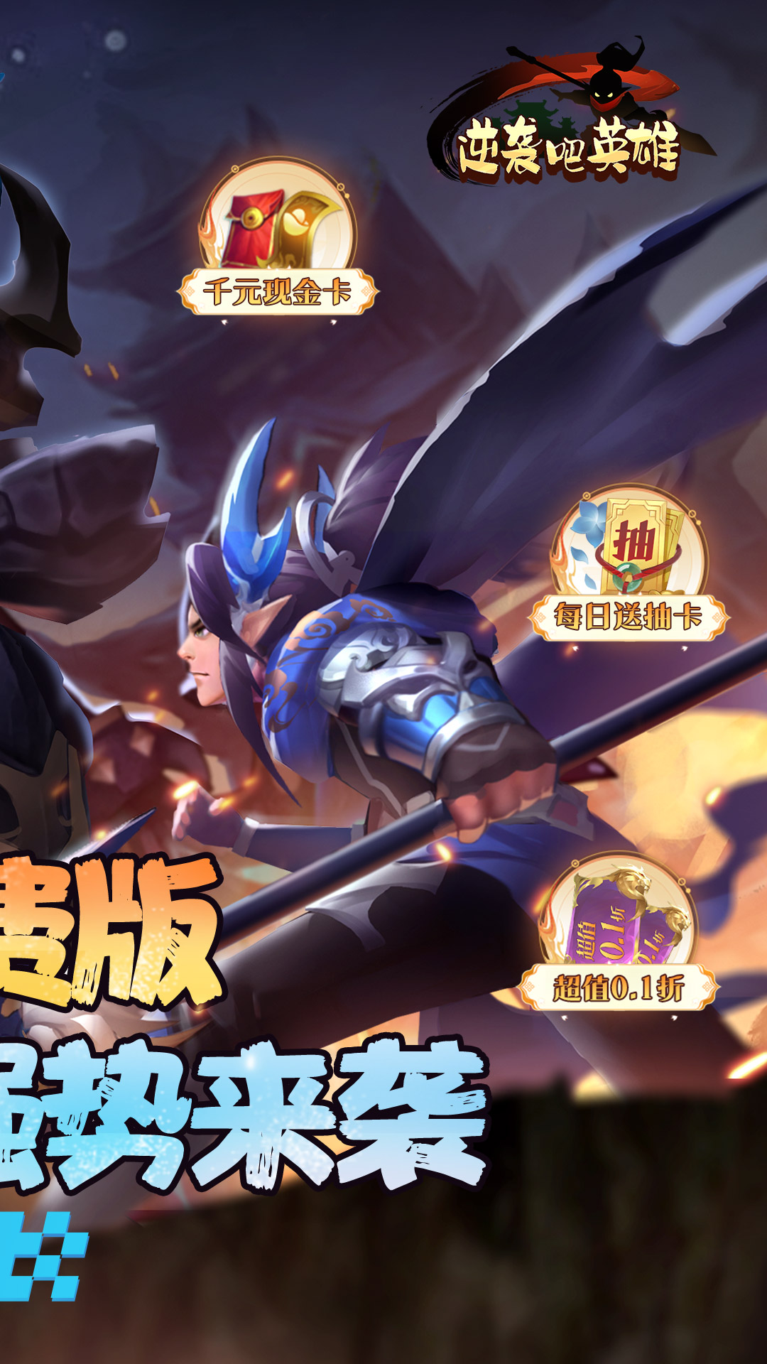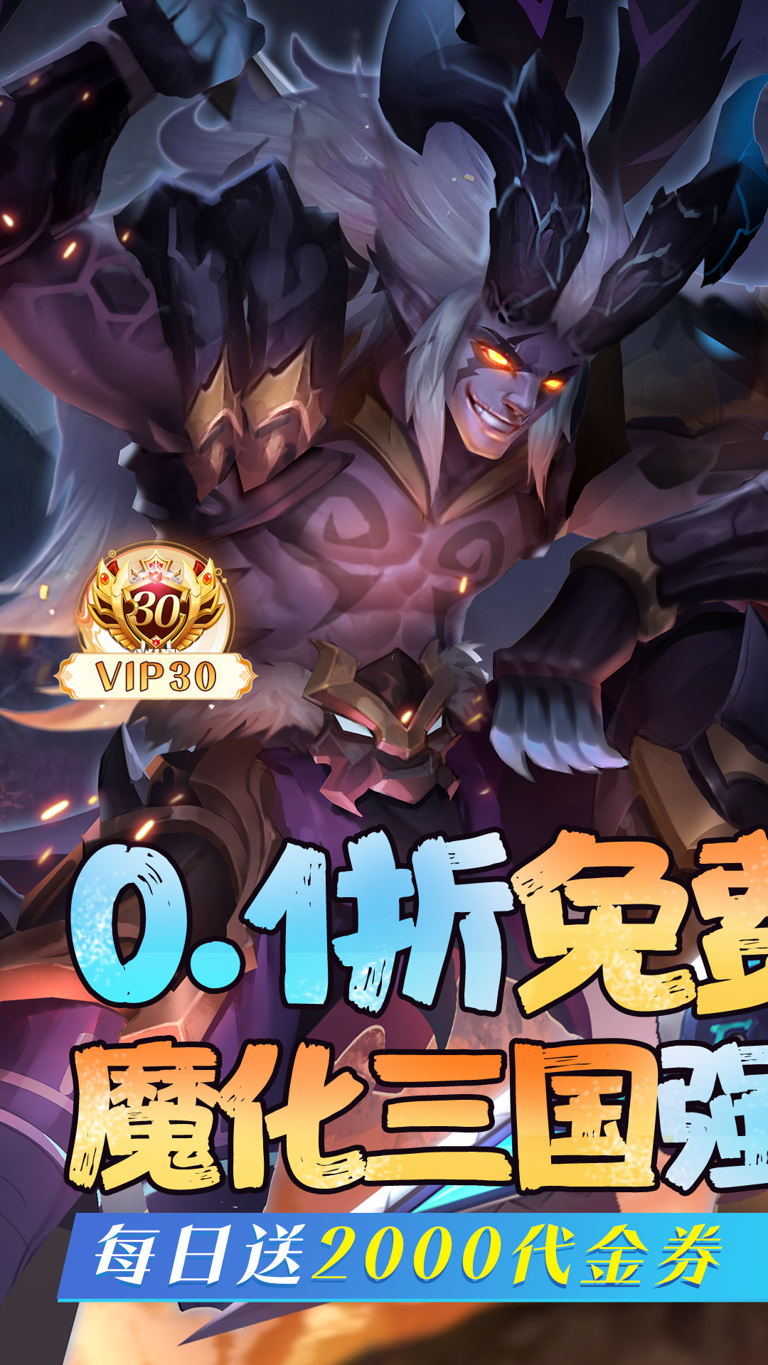 0、每天送2000代金券,免费福利等你拿1、上线送VIP30,千元现金卡,极品装备2、七天登录每天都送强力武将,七日送SSS关羽3、GM破解刷充,直充钻石,直充礼包等等全部免费刷充4、累计登录送10万元现金刷充,在线活跃每日送点将抽卡5、超值0.1版,所有充值真实0.1折6、国战攻城送海量声望,轻松领取丰厚封赏礼包