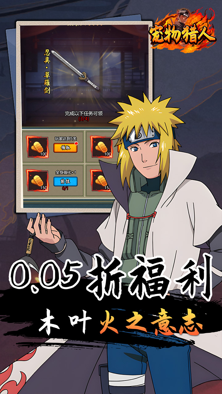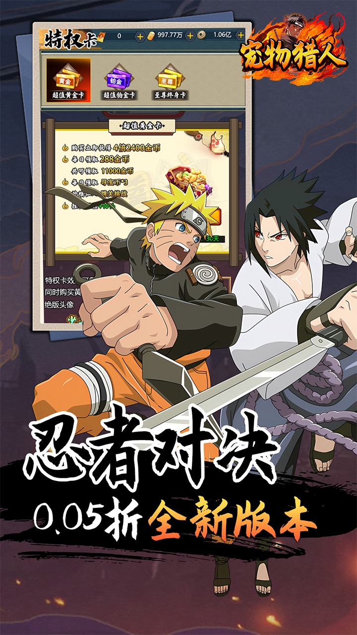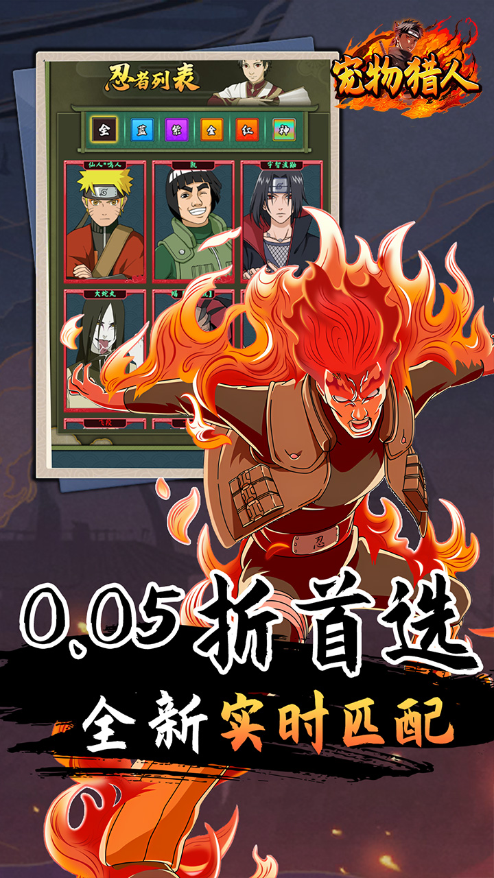 《宠物猎人(0.05折忍者对决)》是一款动漫题材,有着创意背景、百种BOSS、各路忍者和独特战斗体系的卡牌对战手游。其中引人入胜的剧情、自由探索的地图,还有武器打造、提升兵将实力布阵对战,让玩家们在忍者组织之中闯出一番伟业。