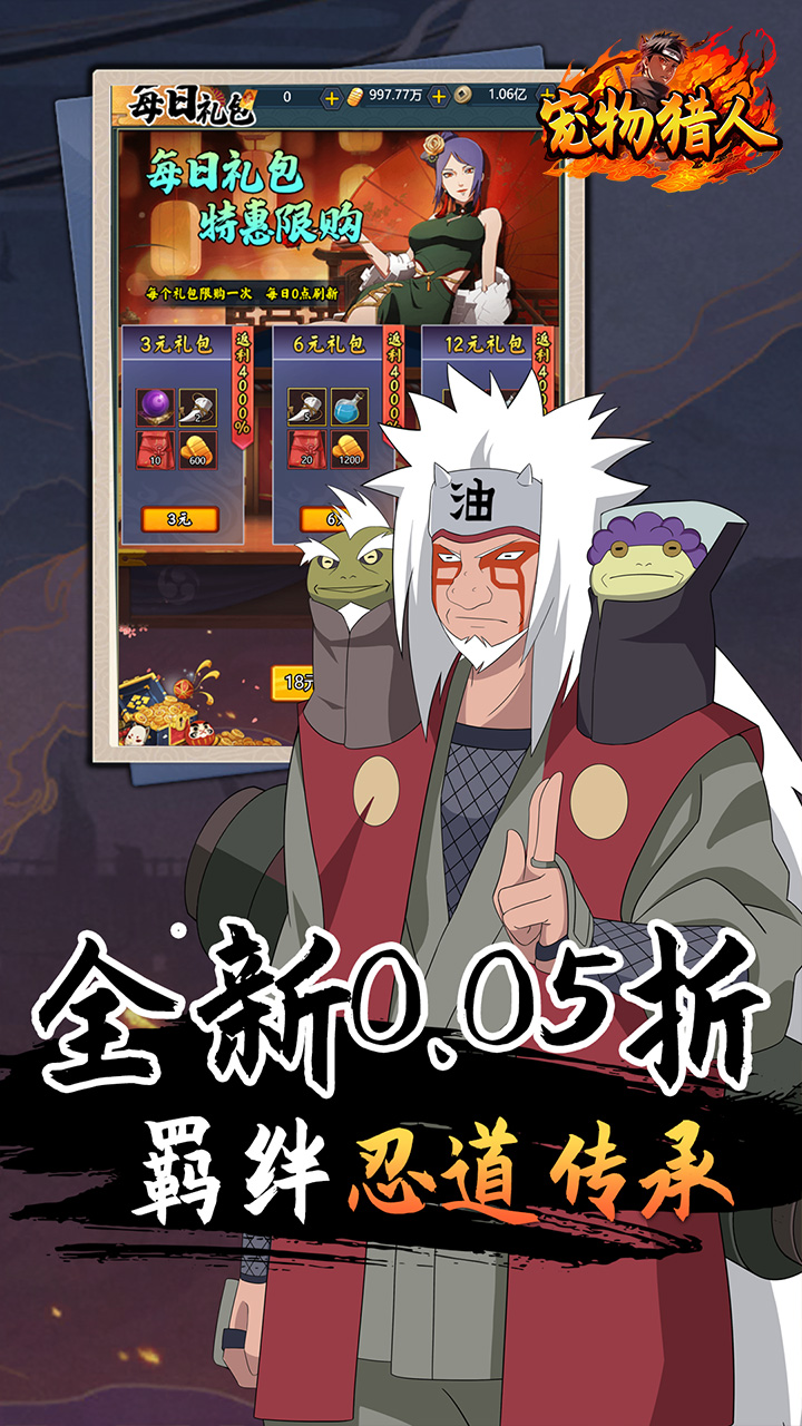 ★动漫卡牌手游,充值享0.05折优惠!★创角即送VIP3、称号·小土豪、超影秘钥*30!★闯关有礼,宝物·封穴飞针、忍者·佐井等超多豪礼免费领!★晋升功能还有海量货币等你拿!★每日签到可领取自来也碎片和大量演武令!累计签到还送神兵·自来也通账!★七日登录送豪礼,忍者·纲手、面具、卷轴、时装、异宝橙装免费领!充值比例1:100