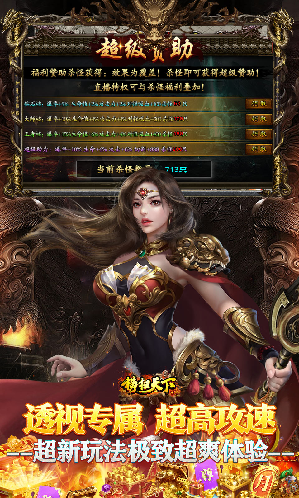 全新透视版本,免费打金、免费爆充、免费领充值、免费透视。结合了神器、切割、打金、攻沙等玩法,剧情丰富有搞头,技能特效有讲究,战斗冒险纵横驰骋,热血的战斗为你带来超爽的体验!特色剧情精彩纷呈,每一篇大陆都拥有专属的玩法与扣人心弦的剧情。此外,独创的无任何门槛三大系统--神通、命魂、秘宝,与专属装备完美搭配,趣味性瞬间拉满,为玩家带来一场充满惊喜与挑战的传奇冒险之旅。