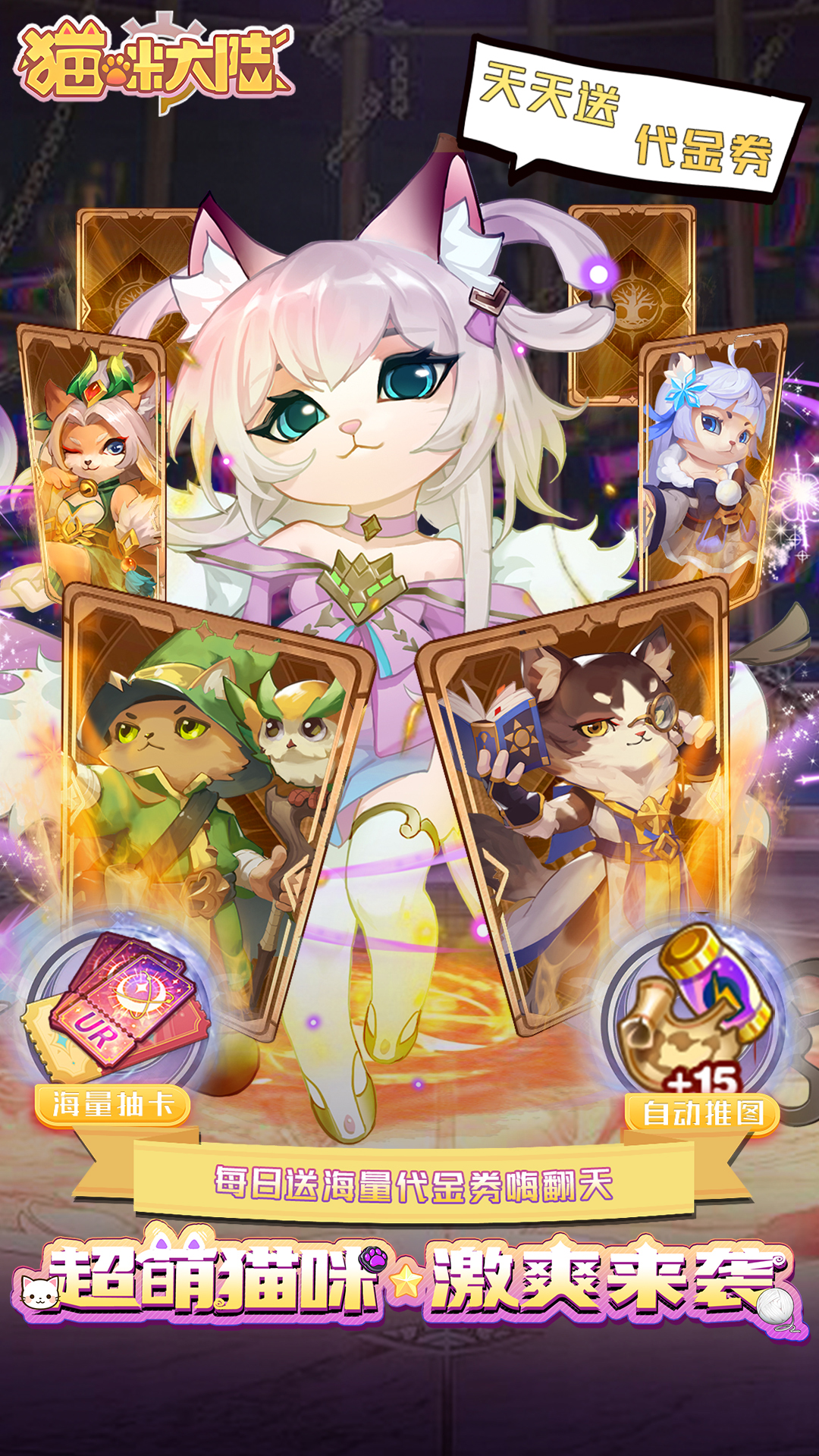 《猫咪大陆(0.1免费版)》开局即送3000代金券,海量直购免费买,不氪金也能畅玩;送毕业阵容 ,初期-毕业4套阵容畅玩包爽;每天上线领3000代金券,实现钻石自由;自动推图没烦恼,一键托管解放双手!快来一起撸猫畅玩吧!与喵界守护者一起,抵抗食梦魔入侵,维护喵界和平!