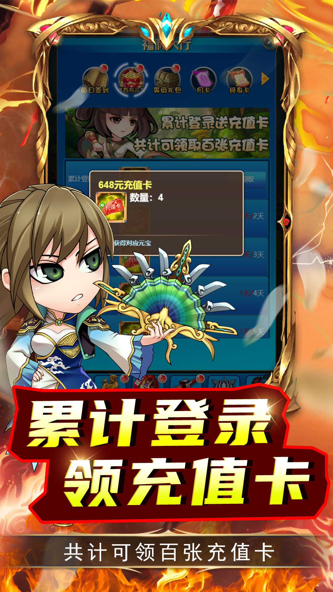 上线即送GM14、100w元宝、188w绑元、1亿铜钱1.签到领取海量元宝2.累计登录领取充值卡3.升级得金将包、充值卡豪华道具4.闯关送海量碎片兑真充
