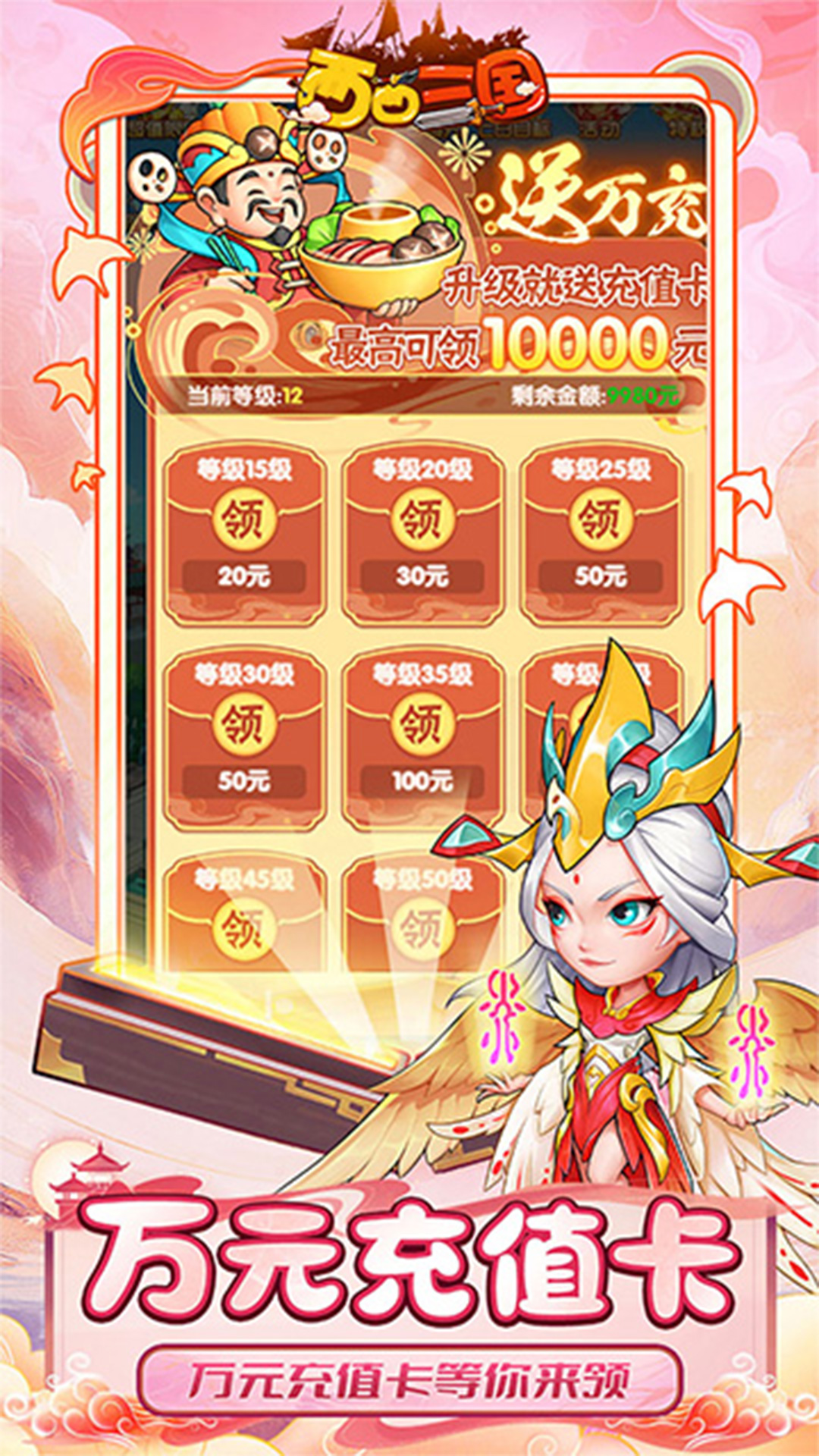 1.任务送海量核心神魔武将 免费送至10星!2.升级送万元充值卡 vip免费升级、送2倍速、送跳关特权,周卡、至尊卡免费激活!3.进游送免费千抽,登录送自选神魔武将!4.日常任务送海量充值卡 vip经验!5.新手任务完成立送s+魔·关羽!6.通关征战送s+魔·赵云7.爬塔送s+神·吕布8.游戏内全0.1折充值