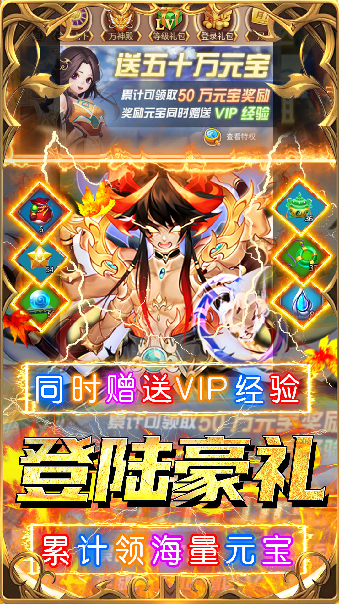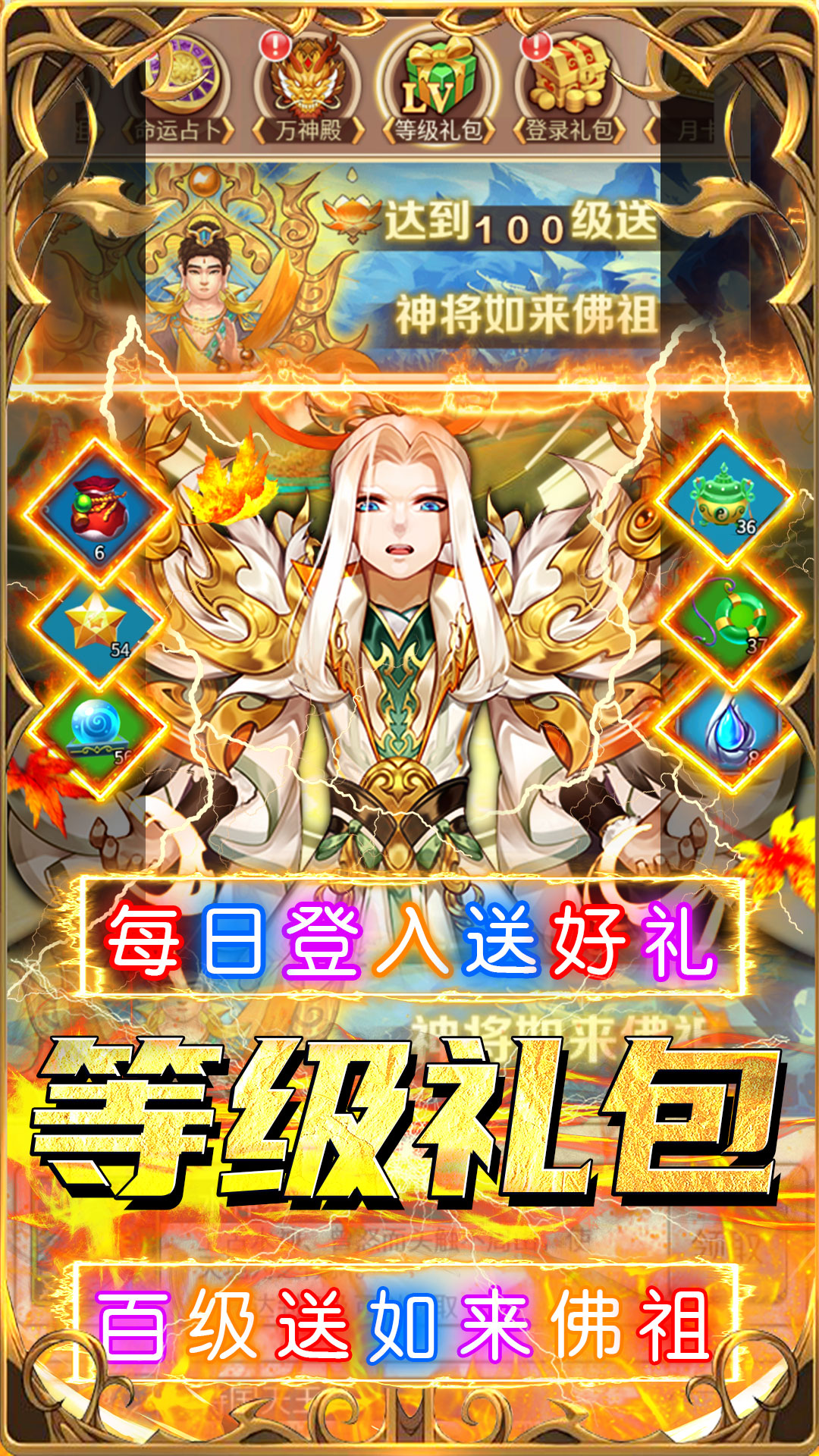 1,登录礼包,每日登录都有好礼相送!2,累计登录奖励海量元宝同时还赠送超多vip经验!3,七日福利,完成七日目标领取神将弥勒佛祖!4,节日活动,登录送豪礼,海量元宝、仙人信物等道具免费领!