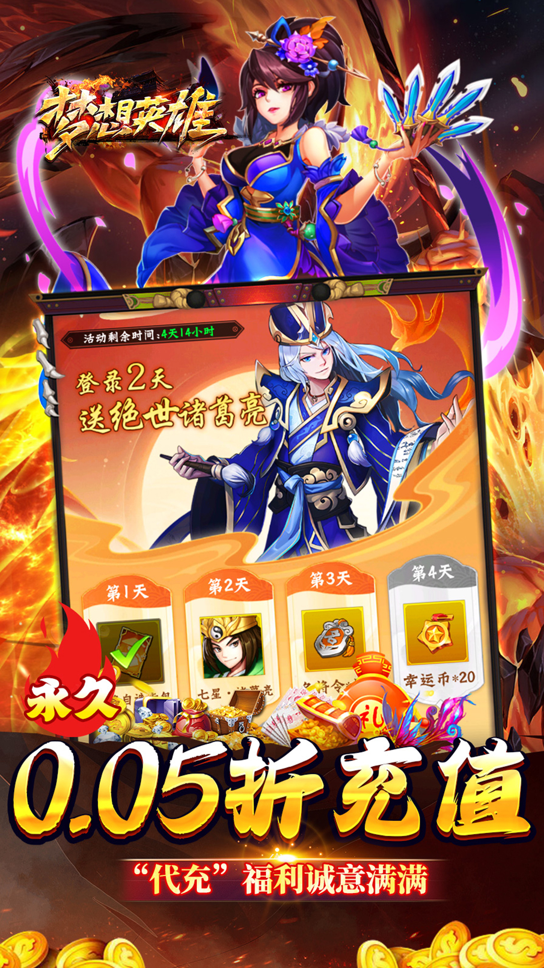★福利①:全场永久充值0.05折,充值比例1:100(元宝);★福利②:上线即送自选无双名将礼包,铜币百万,元宝180000,海量英雄经验;★福利③:升级送万元代金券,礼包充值拿到手软;★福利④:新服狂欢,次日登录领取神将“七星-诸葛亮”,7日领取“济世-华佗”;★福利⑤:通关主线关卡,领取千抽神将令;