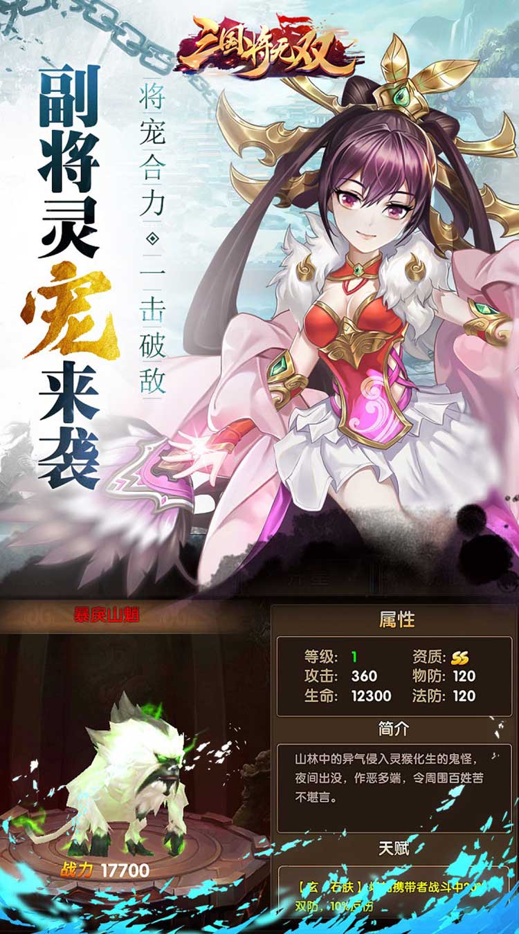 丰富的养成线让主公可轻松挖掘武将潜力,通过武魂、战魂系统全面提升属性,更可装备神兵使技能“觉醒”,让必杀技威力加倍提升,对敌军造成多重负面效果!此外,团队可召唤兽灵之力为武将增幅能力,还可从百余萌宠中招募伙伴携带上阵,运用强大的羁绊之力毁灭敌军!