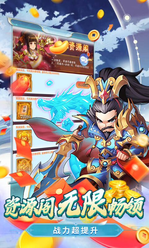 ★上线送万元真充、送新手大礼包、送V15,首充礼包免费送。★特权每日送至高3000代金券,还有宝物、英雄、装备等你拿。★签到每日送好礼;更有豪华签到,随等级提高,每日可领取的奖励不同。★周卡、月卡每日送抽;更有无限资源可以无限领取进阶丹、经验、精华、觉醒丹等。★开通折扣特权,游戏所有充值最高享受8折优惠;