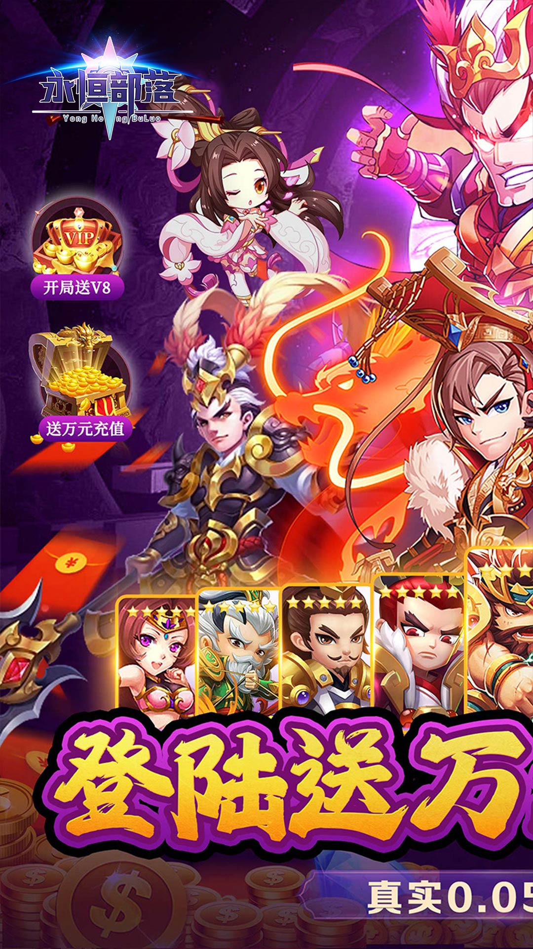 ★天神开局送V8,88888元宝,88W金钱★万元充值,各种充值卡免费送,完全白嫖★每天签到海量神将令免费领★战力提升,武将、装备、宝物应有尽有★比例1:50,充值全场0.05折