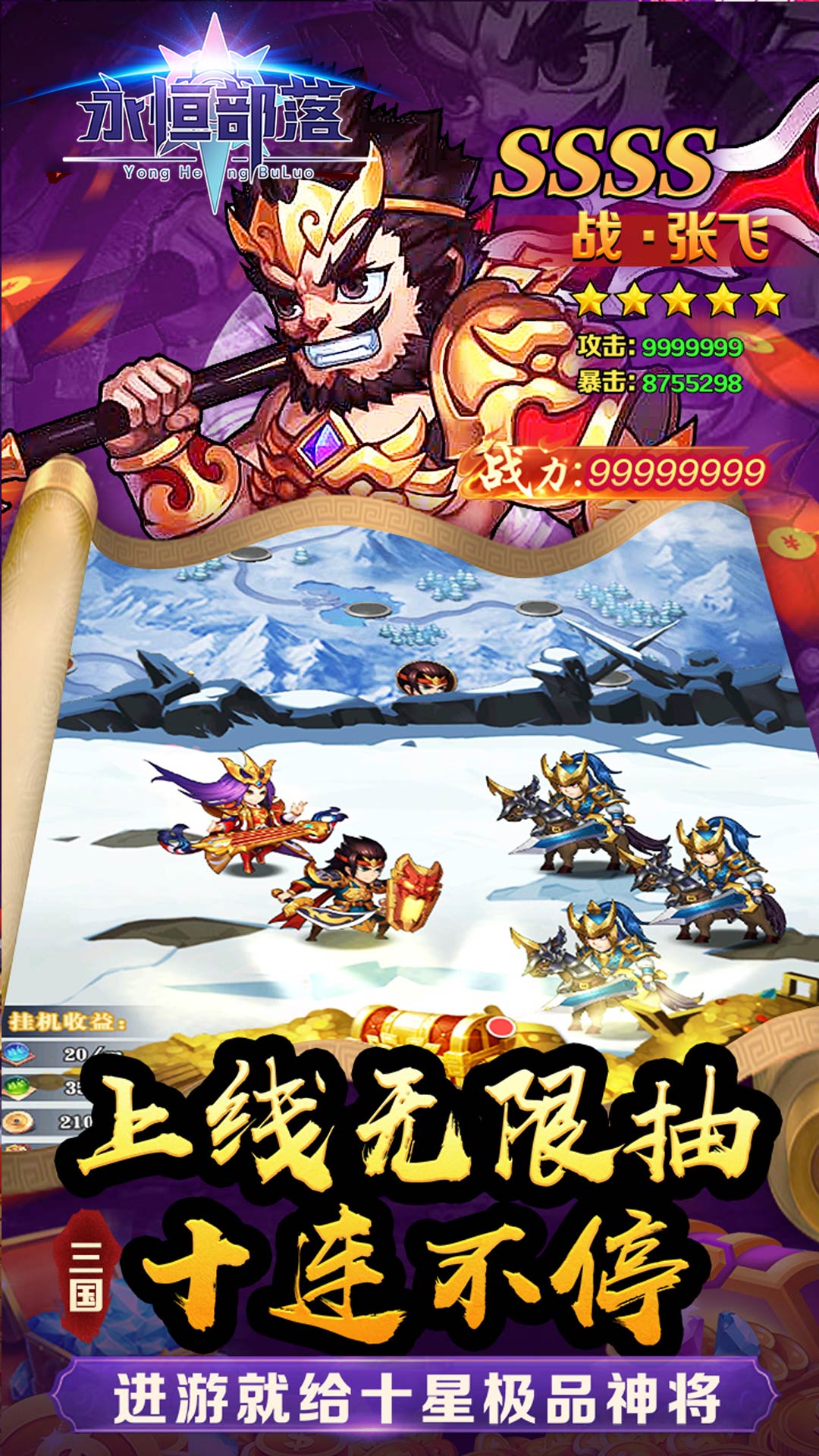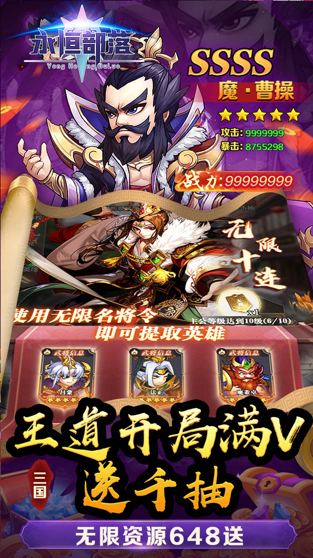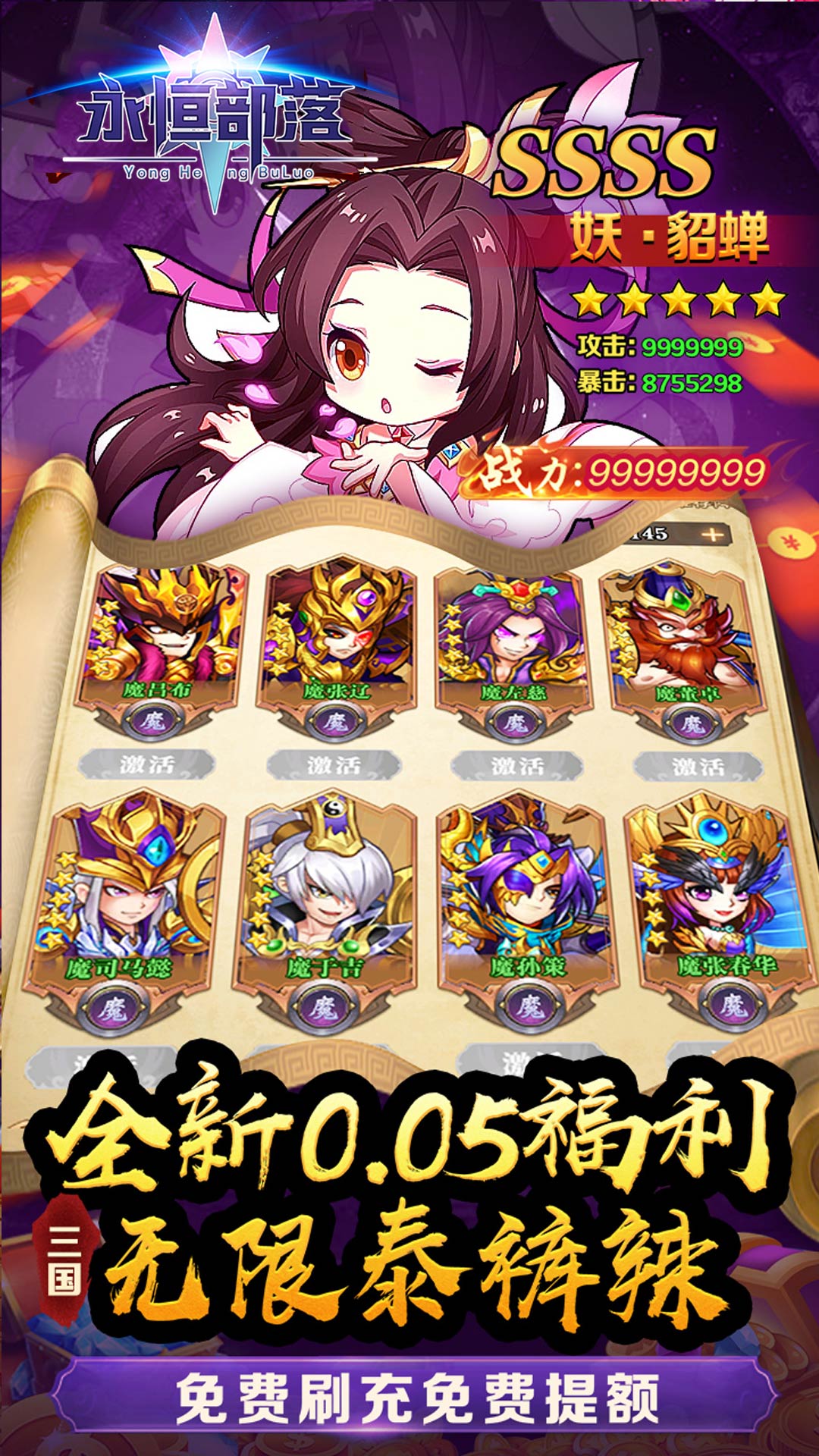 这是一款三国卡牌类手游,福利版本充值仅需0.05折扣,天神开局送V8,VIP礼包领不停,每天登陆更有海量神将令赠送,海量神将等你来收集。万元充值等你来免费领取。赶紧带领你的无敌团队来横扫三国吧。